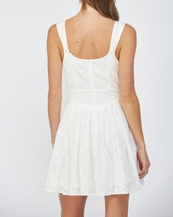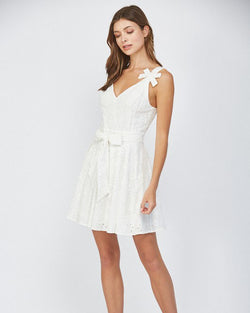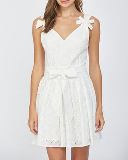 The perfect little white dress! This cutie features an eyelet lace fabrication throughout, a sleeveless silhouette, a self tie at the waist and bow accents on the straps. A summer staple that is perfect for parties, day events, graduations, showers and more.