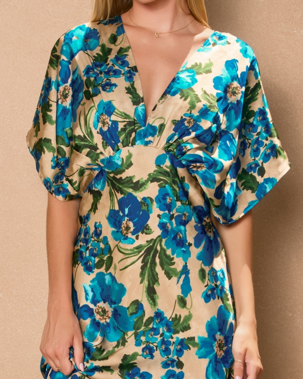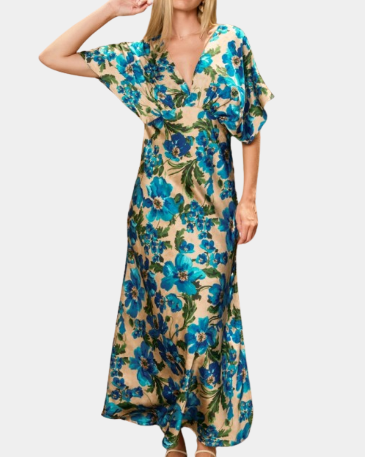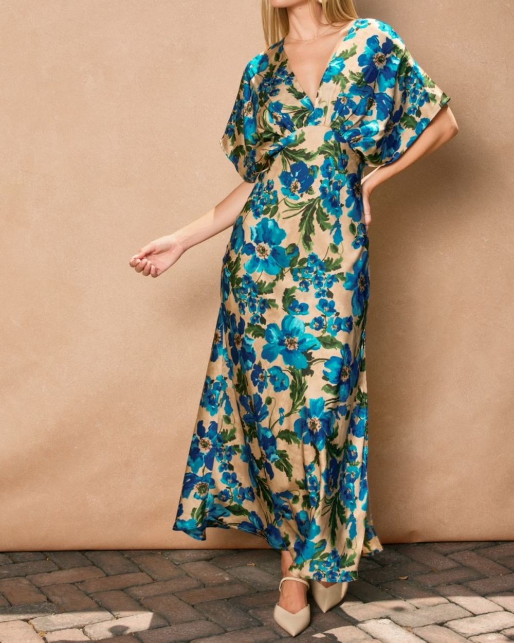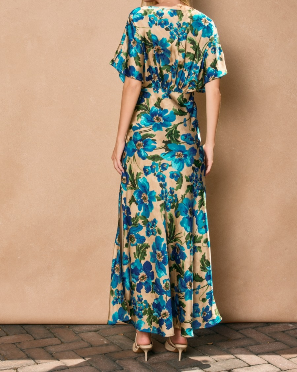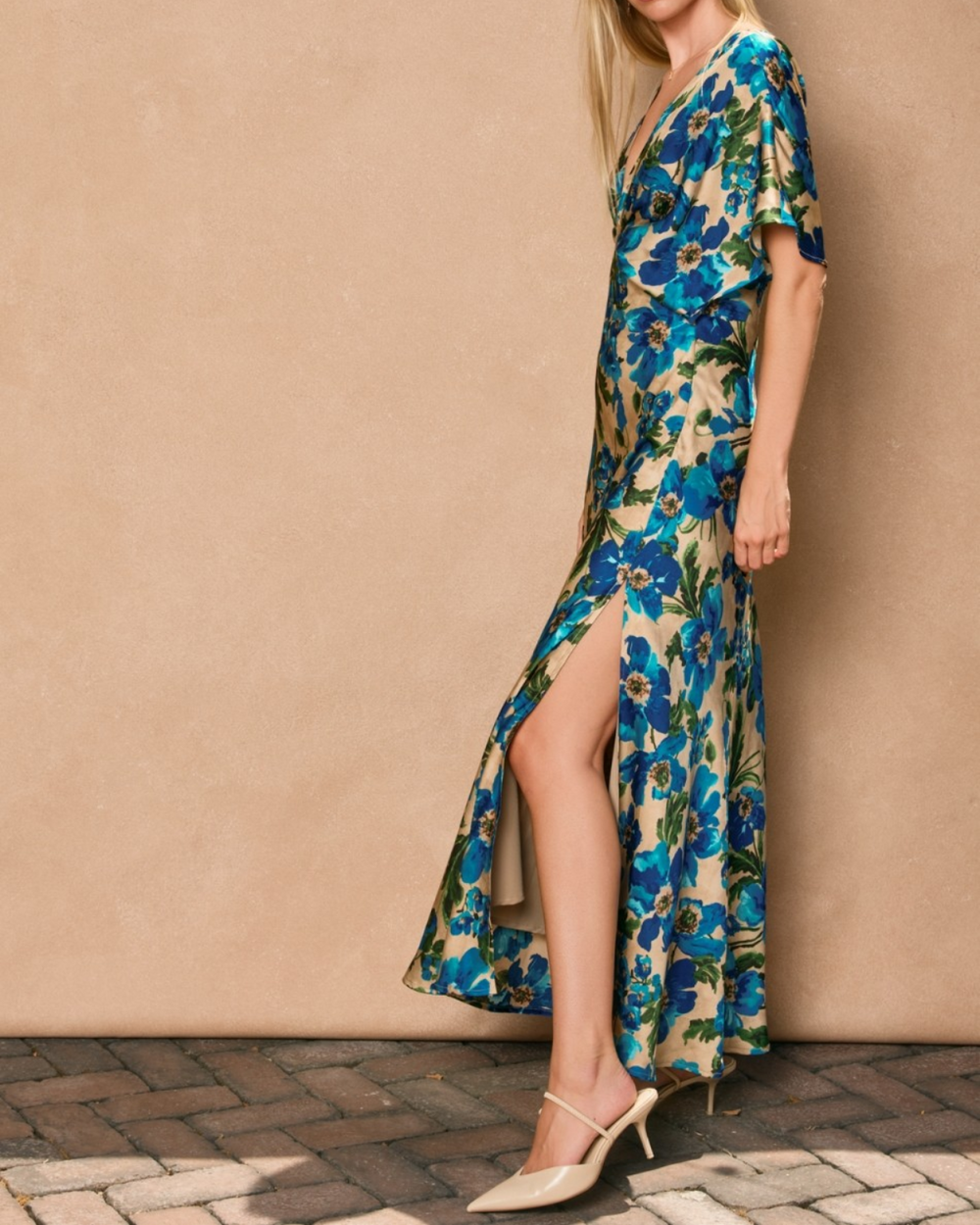 Float through your day in this Floral Satin Maxi Dress, featuring a breezy blouson top and a flirty slit for just the right amount of sass. Perfect for twirling under the sun or turning heads after dark.