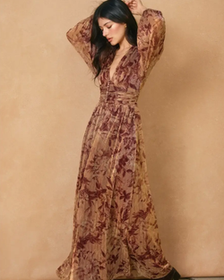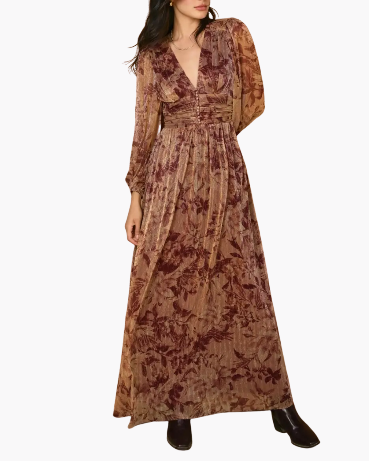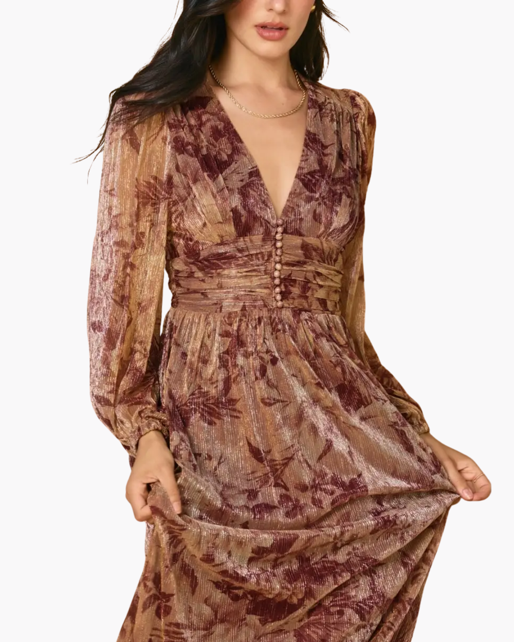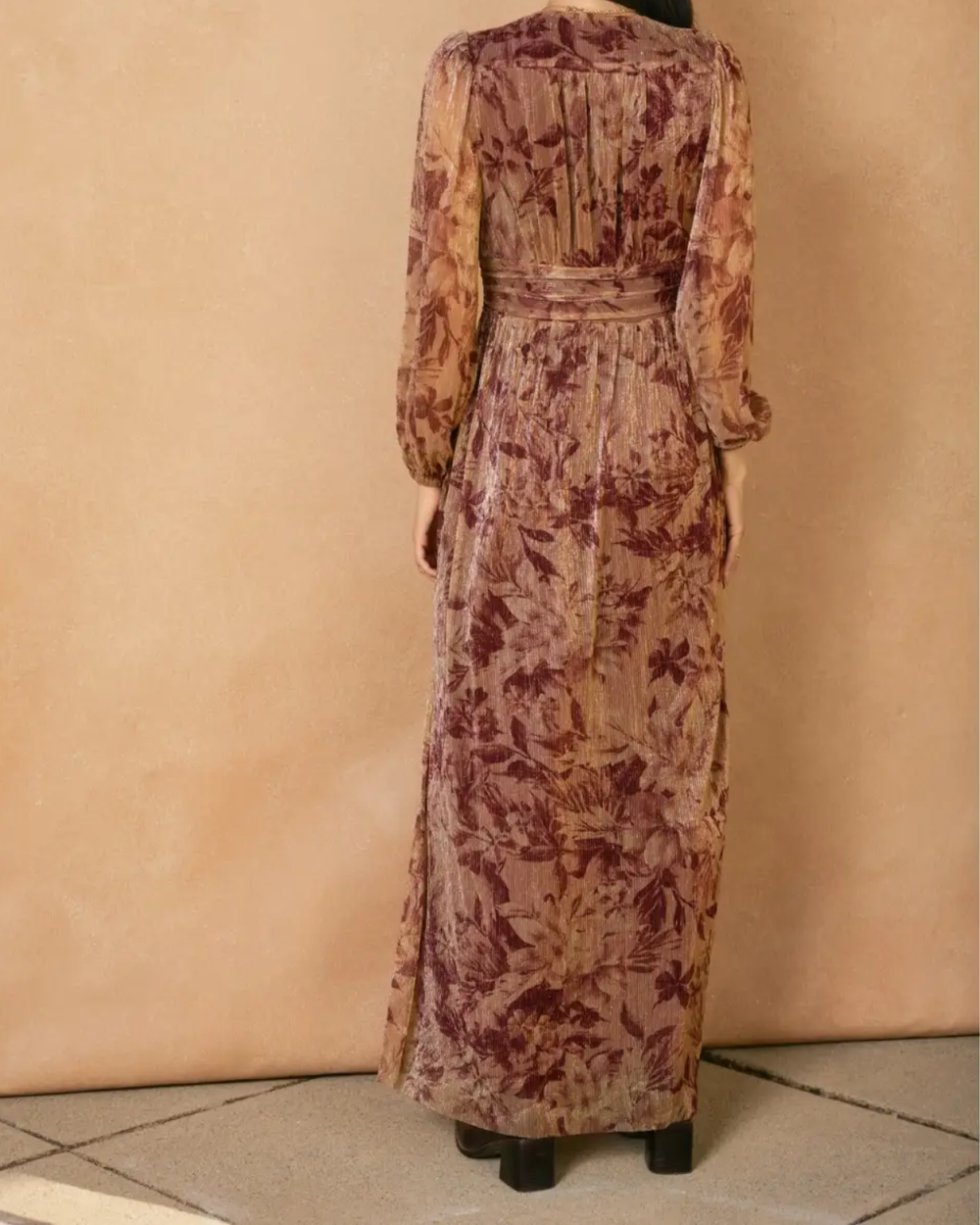 Twirl into the spotlight in this show-stopping maxi dress! Delicate floral prints dance across luxurious fabric adorned with shimmering gold metallic lurex that catches every light.