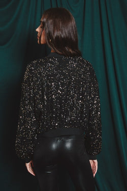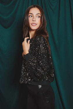 Add a sparkle to your style with this slightly cropped sequin bomber jacket. Featuring a button-front closure, it’s the perfect playful piece to make any outfit pop with black and gold shimmer. Stand out and shine wherever you go!