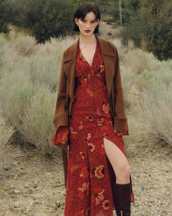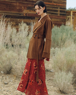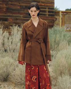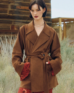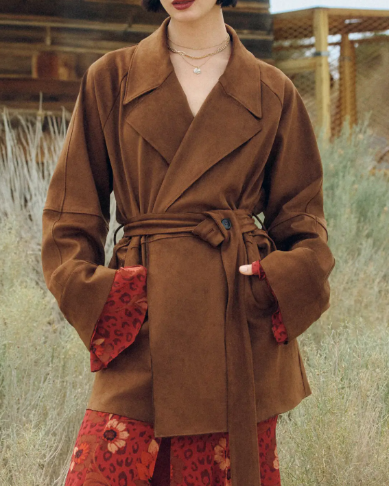This tobacco brown suede trench coat features a classic collared design with a flattering v-neckline and a sash belt secured by a button, offering both style and adjustable comfort. Its rich, warm hue and soft suede texture make it an ideal outer layer for fall, blending timeless elegance with practical warmth. Perfect for layering, this coat elevates any outfit while providing a sophisticated silhouette.