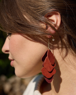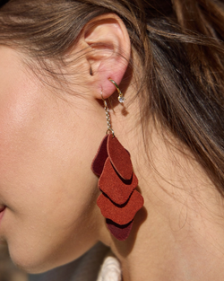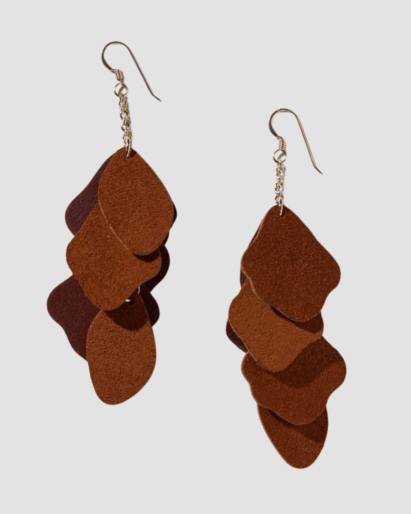 The Florence earrings feature layered lamb nappa leather paired with a gold chains, offering a soft, voluminous design with graceful movement. These versatile statement pieces effortlessly enhance your style with understated elegance.