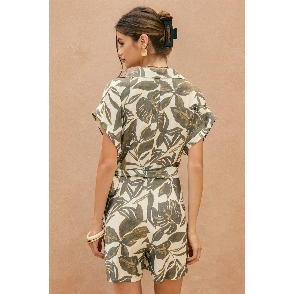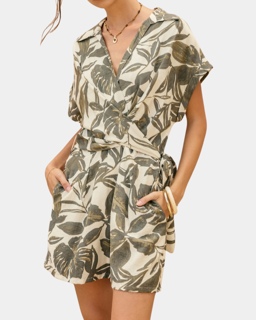 Sway into summer in this breezy tropical leaf romper. Cinch that waist, catch those vibes, and let the palm print do the talking.