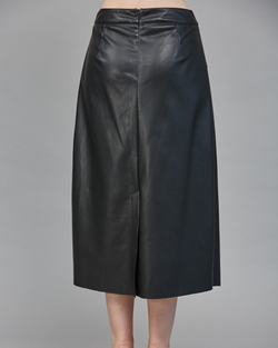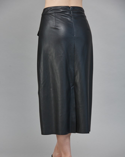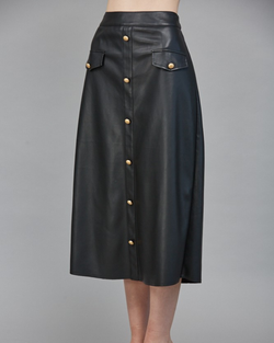 Elevate your style with this high-waisted faux leather skirt featuring bold gold button detailing down the front.