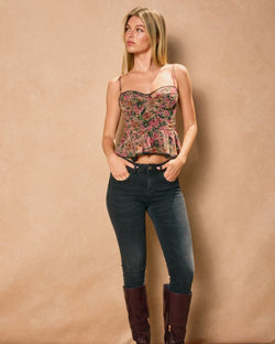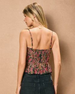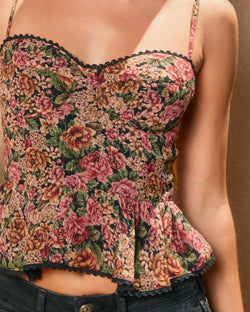 This vintage floral print lurex cami top features a sweetheart neckline, adjustable shoulder straps, lace trim and a flared ruffle hem. This top brings the glam and can be styled with everything from jeans to skirts to pants. Great for layering too!