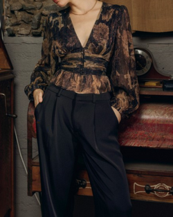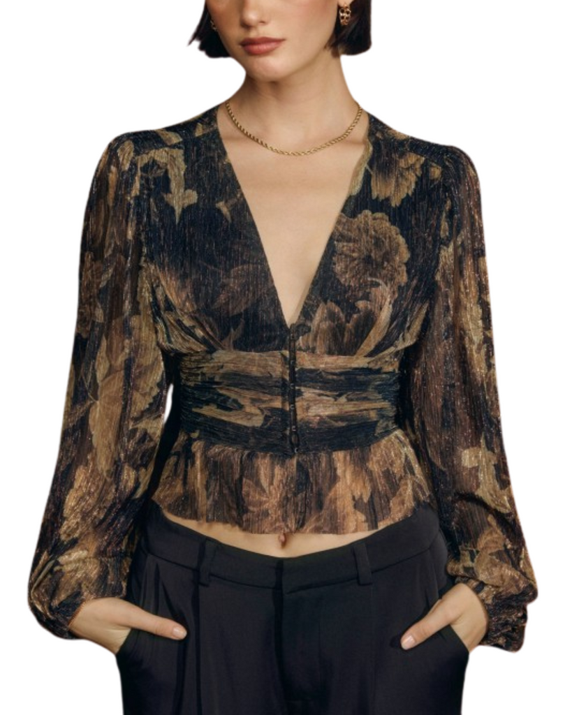The Grains of Time Plunging Raw Hem Blouse in Bronzed Bloom features a flirty plunging neckline and a relaxed raw hem, adding a playful edge to your everyday wardrobe.