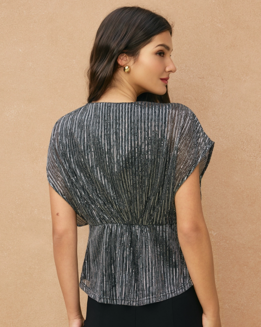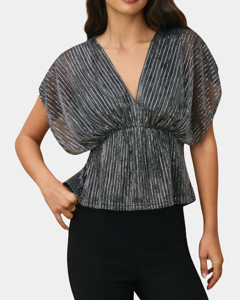Catch the light in this shimmering blouson top featuring metallic silver details that sparkle like shooting stars. The relaxed silhouette pairs effortless style with eye-catching glamour.