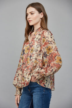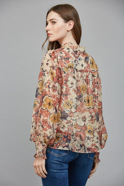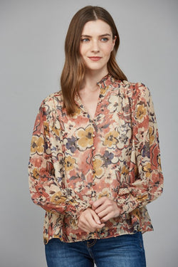 Elevate your wardrobe with this exquisite floral print blouse featuring delicate ruffles and a subtle lurex chiffon fabric. The high neckline adds a refined touch, while the beige combo palette offers versatile elegance. Perfect for sophisticated occasions, this blouse effortlessly combines timeless style with a modern shimmer.
