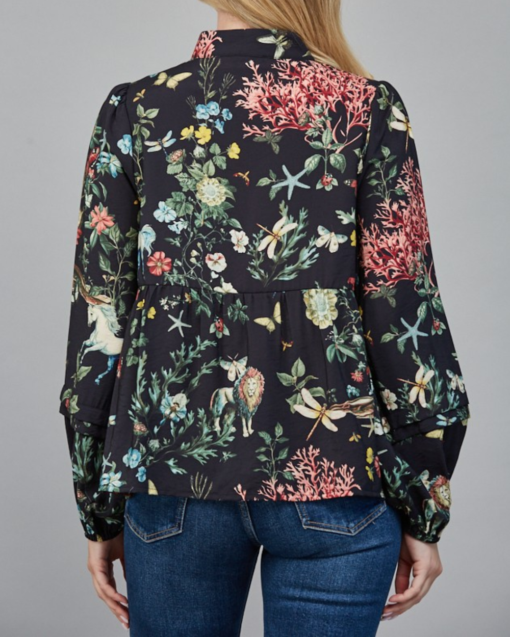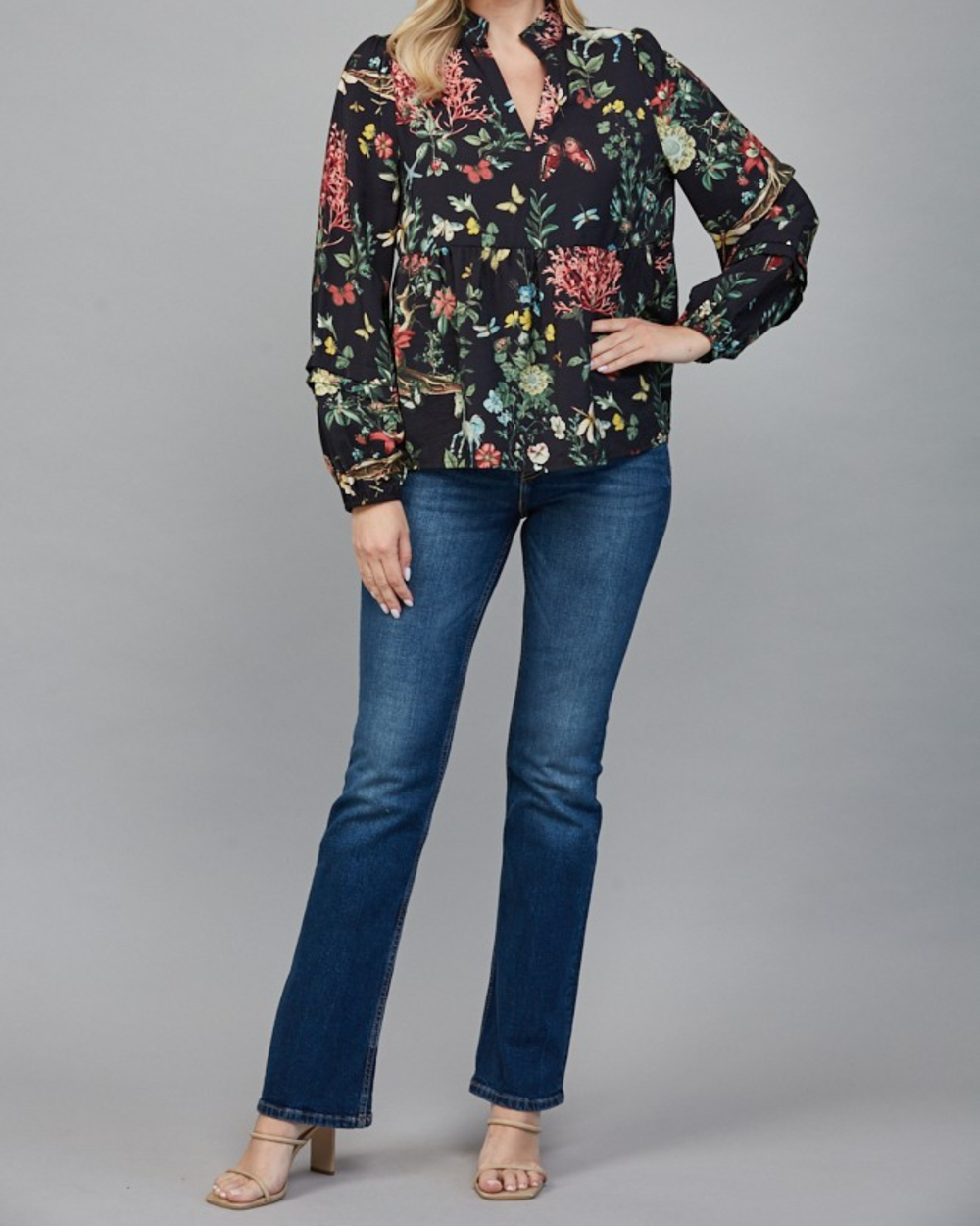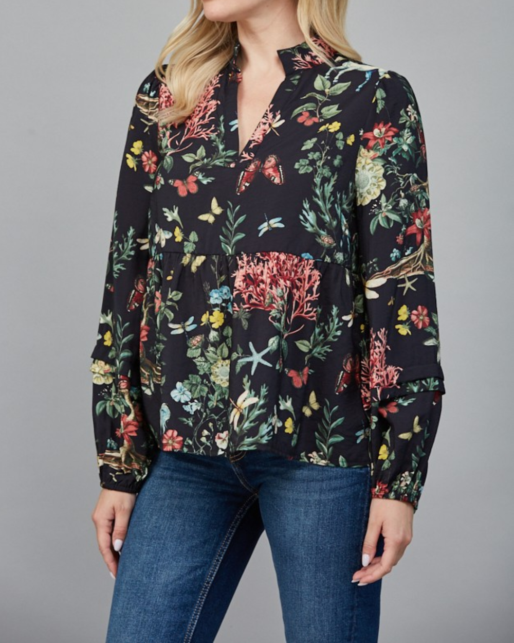 This V-Neck Printed Top in Black Multi features a flirty empire waistline that drapes beautifully, adding a playful bounce to your look.