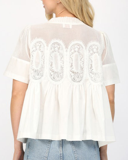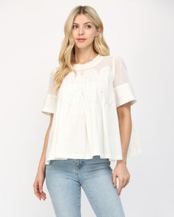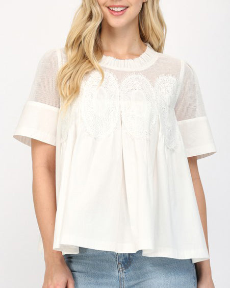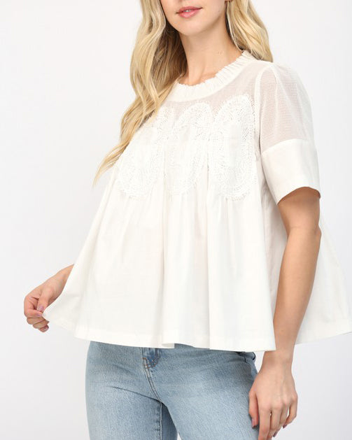 This cotton top features mesh on the top and an applique detail. A classic shape and style with flair that can be worn for work or play.