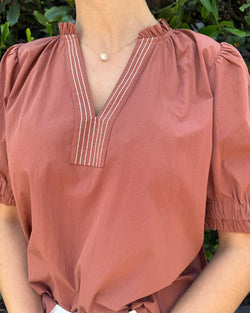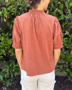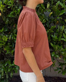 This classic top features a v-neckline and short sleeves with smocking detail. A versatile top that can be styled for work or play, this top is comfortable and chic.