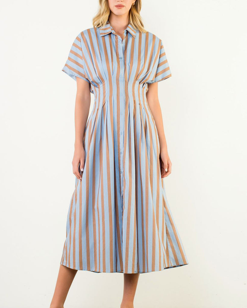 Slip into effortless style with this striped maxi dress featuring a button-down front and a chic collared neckline. The delicate pleated detailing adds a touch of elegance, while the accented waist highlights your silhouette for a flattering fit. Perfect for casual outings, this blue and tan maxi dress combines comfort and flair for a look that’s both relaxed and refined.