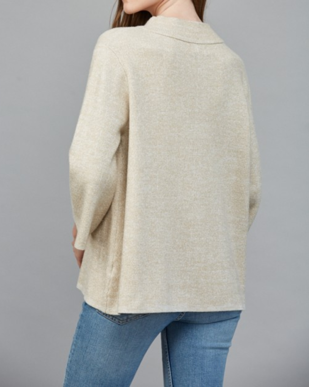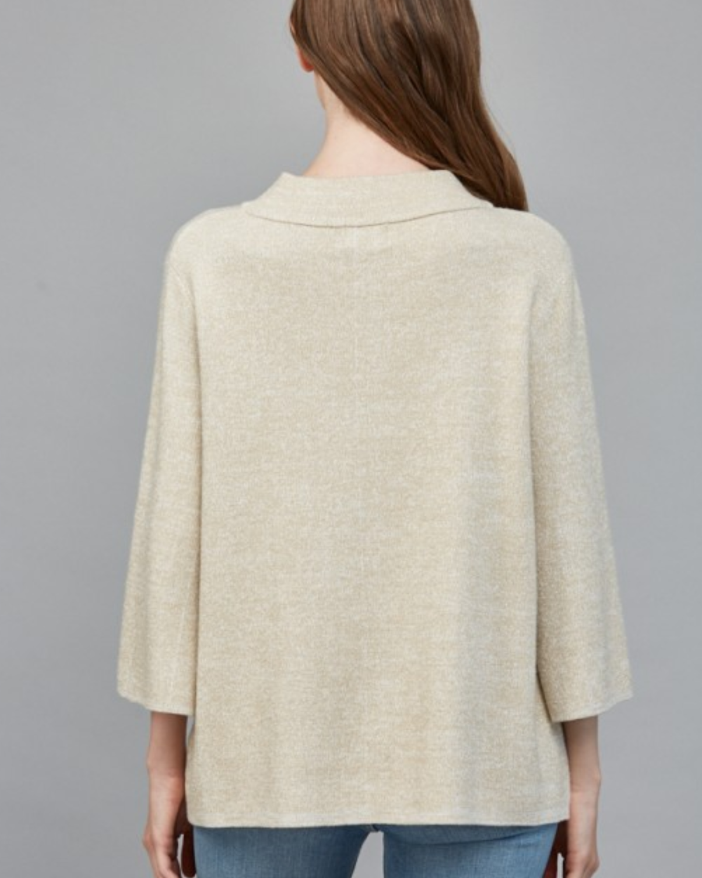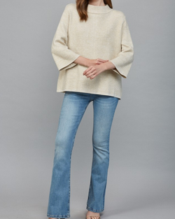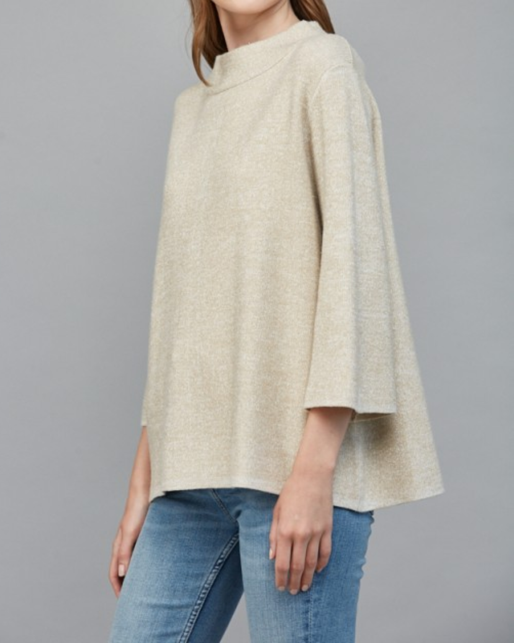 This shimmering metallic yarn sweater shines with a playful cream and gold blend. Featuring a cozy mock neck and flirty bell sleeves, it’s perfect for adding a fun twist to your fall wardrobe.