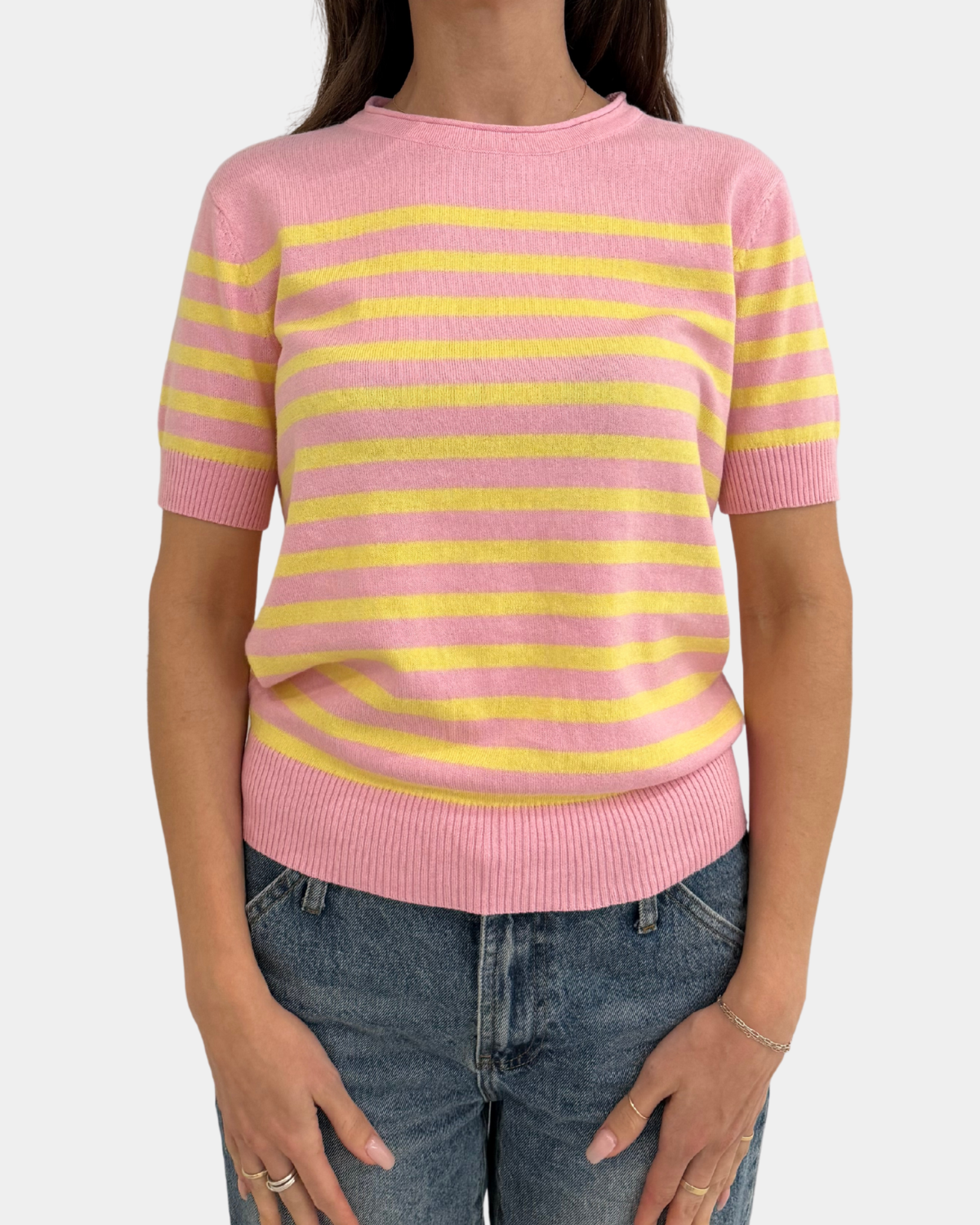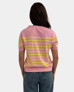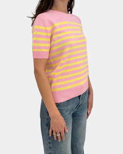 Brighten your wardrobe with this cheerful striped sweater! Featuring a fun pink and yellow color-block design, this short-sleeve knit is perfect for layering or wearing solo.