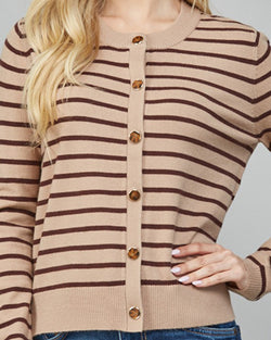 Elevate your fall wardrobe with this cardigan. This sophisticated sweater features a classic button-down design accented by stripes, blending warmth and style effortlessly. Crafted for cooler days, its soft fabric and tailored fit make it an ideal layering piece that complements any ensemble with understated elegance.