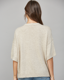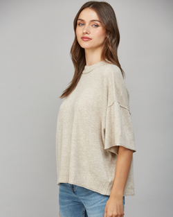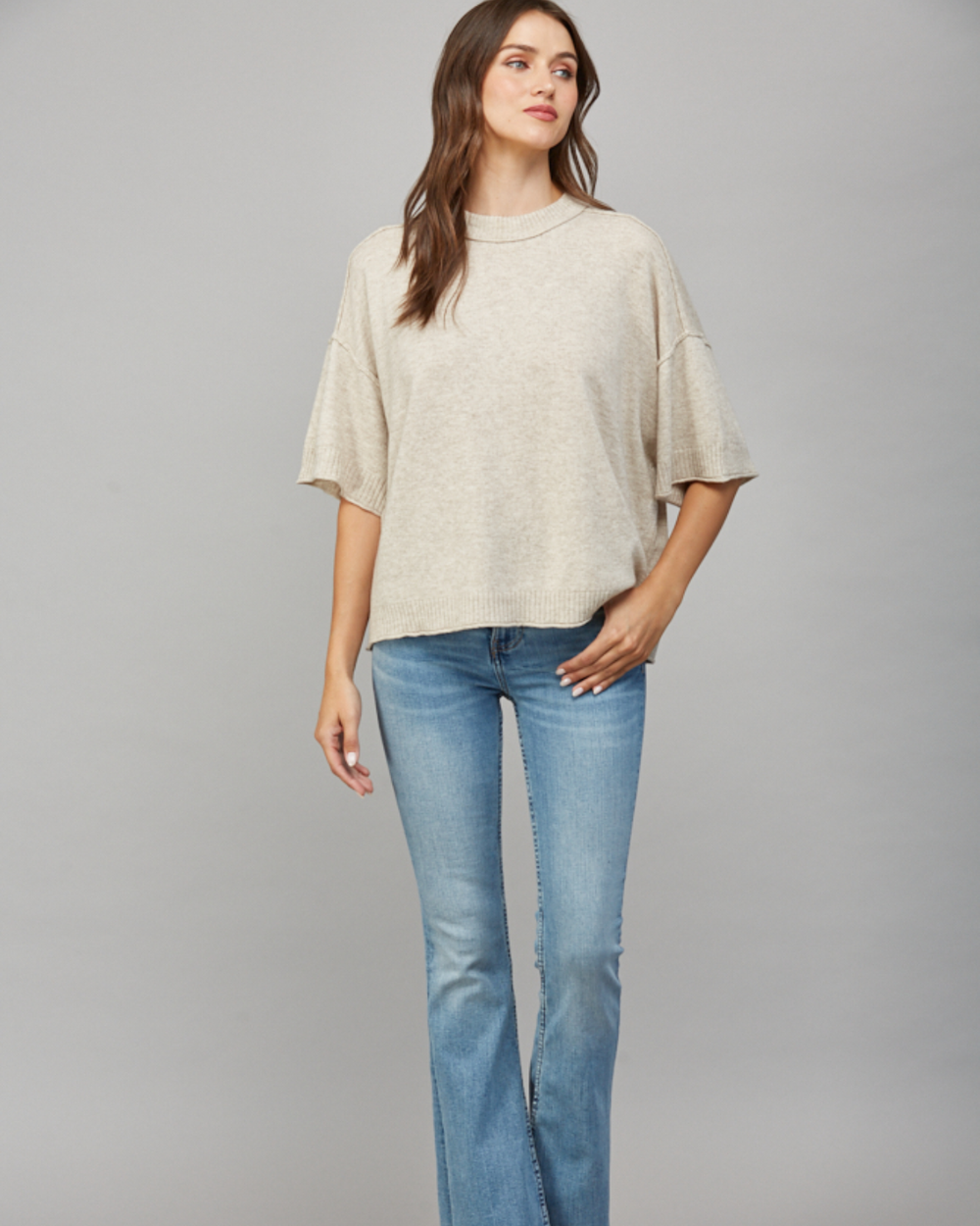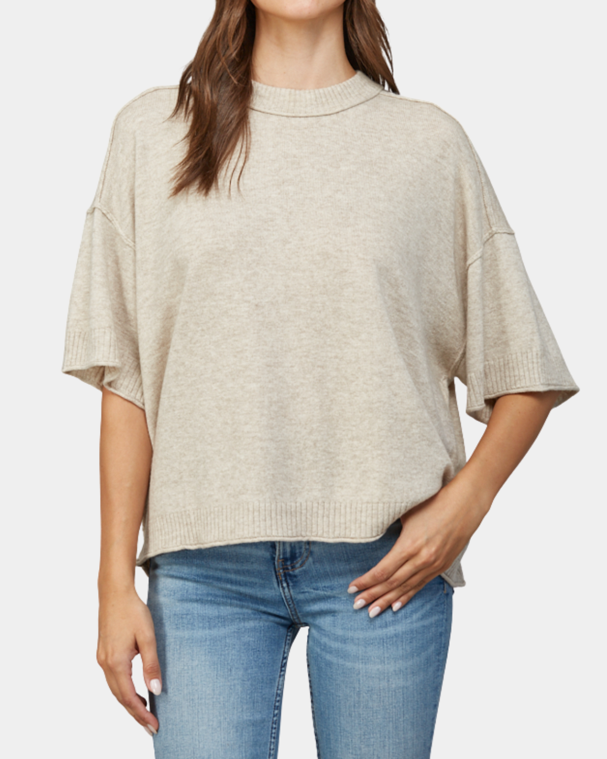 Meet your new favorite sweater—a breezy cashmere blend with relaxed drop shoulders and short sleeves. Soft oatmeal perfection for endless styling possibilities.