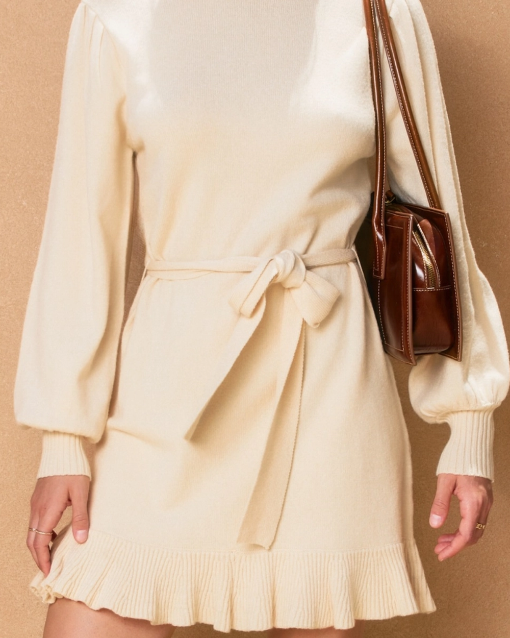 Elevate your everyday wardrobe with this refined sweater mini dress, featuring delicate ruffle detailing that adds an understated touch of elegance. The ivory hue and cozy knit construction make it the perfect piece for transitional seasons, effortlessly bridging casual comfort with polished sophistication.