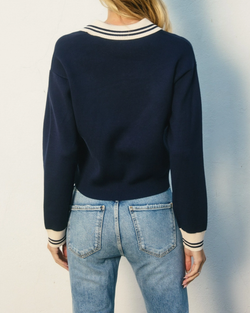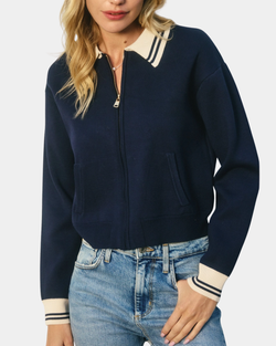 Layer up with navy and ivory stripes that mean business—this knitted jacket features chic contrast detailing at the collar and sleeve openings for a polished finish. Perfect for adding dimension to any outfit while keeping your style sharp and put-together.