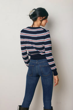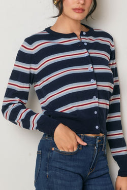 This striped button-down cardigan in a refined navy and red palette offers a polished layer for crisp fall days. Crafted for both comfort and style, its classic fit pairs effortlessly with your seasonal wardrobe, elevating everyday looks with a subtle yet striking design. Ideal for transitional weather, this sweater blends warmth and sophistication seamlessly.