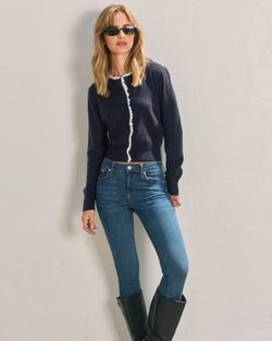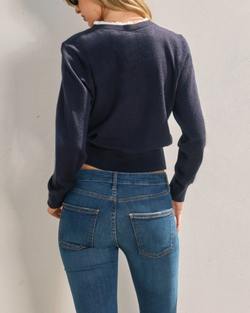 Add a flirty twist to your cozy layers with this navy cardigan featuring charming ruffled eyelet trim and classic button-down style. Perfect for adding a pop of playful elegance to any outfit!