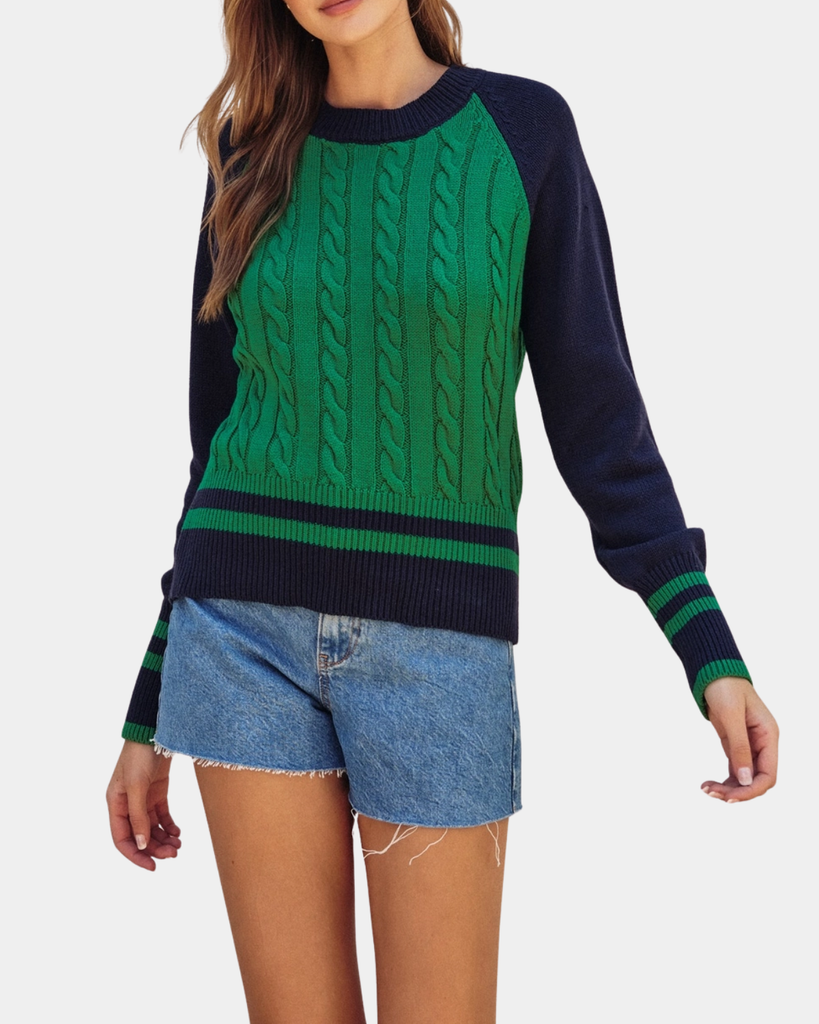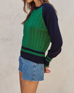 Score big in this varsity-inspired raglan sweater that blends sporty vibes with cozy comfort. The cable knit bodice adds texture and dimension, while classic stripe trim at the sleeves keeps things fresh.
