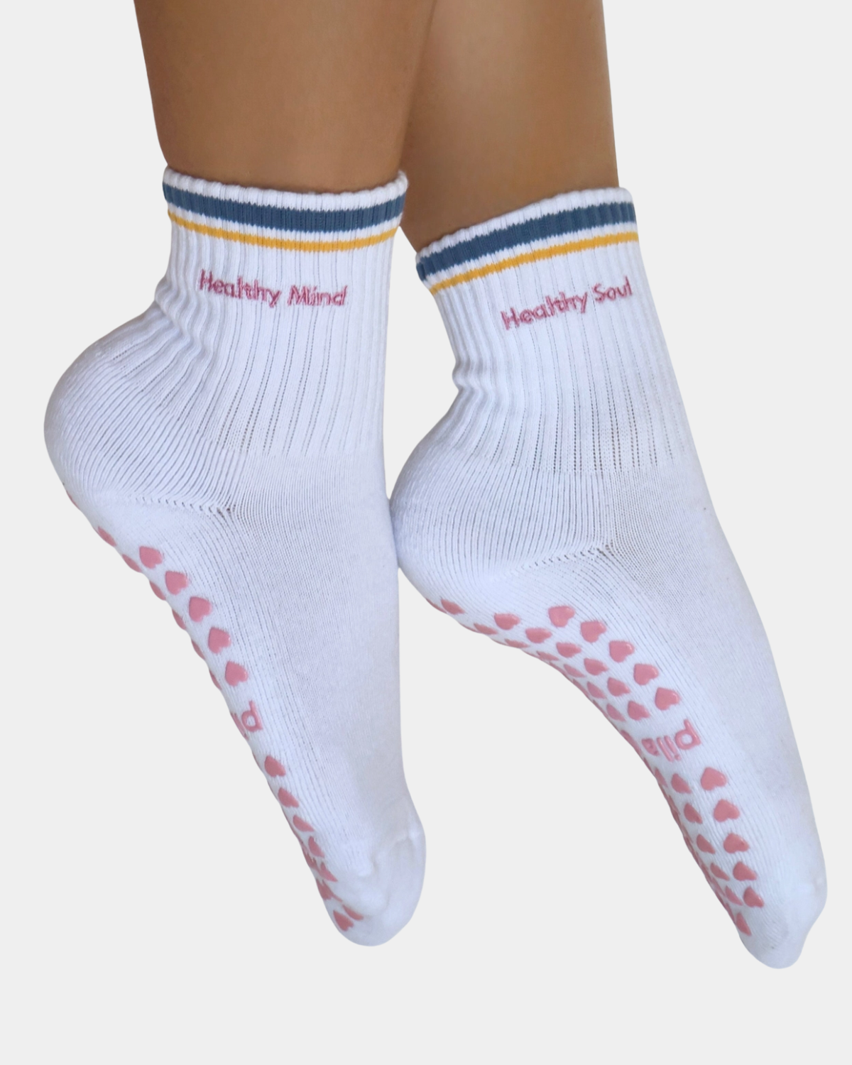 Keep your practice grounded with these playful grip socks. Featuring a crisp white base with classic blue and gold stripes and soft pink embroidery, they remind you to nurture both body and mind—one foot says "Healthy Soul," the other "Healthy Mind."