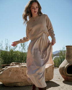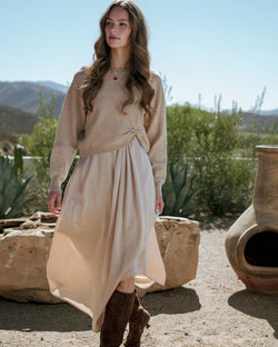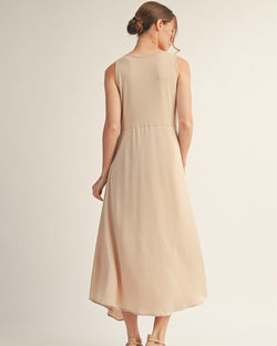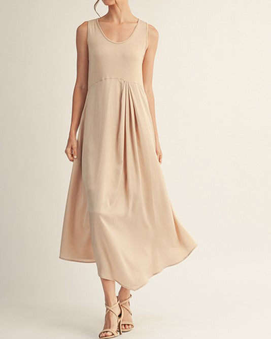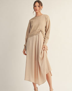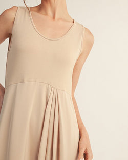 This gorgeous satin slip dress features a sleeveless silhouette, front pleat detail and an asymmetrical cut hem. Style with heels for a night out or throw a sweater on over it for day.