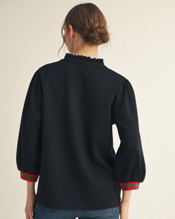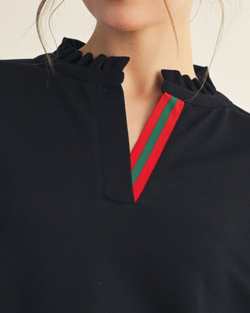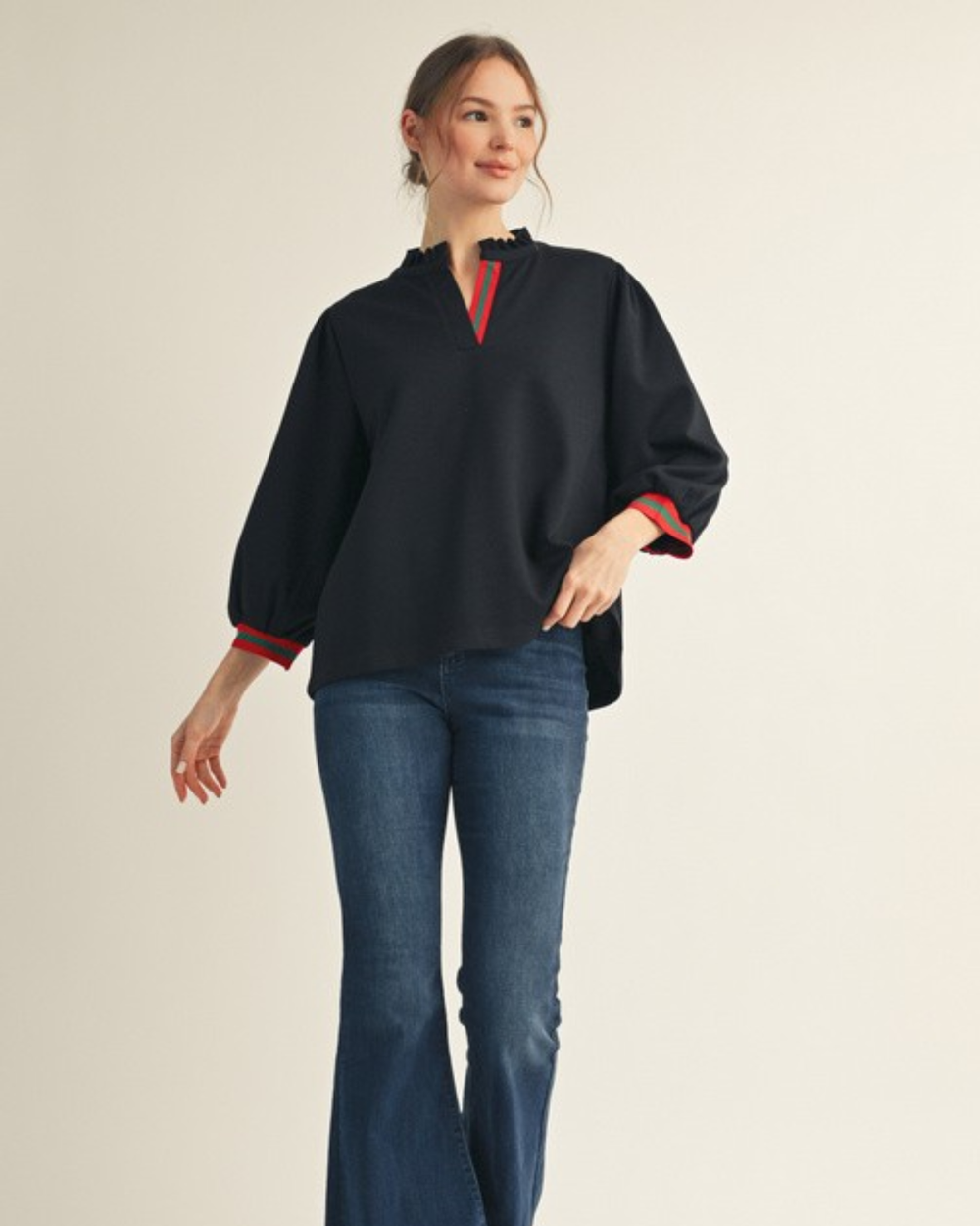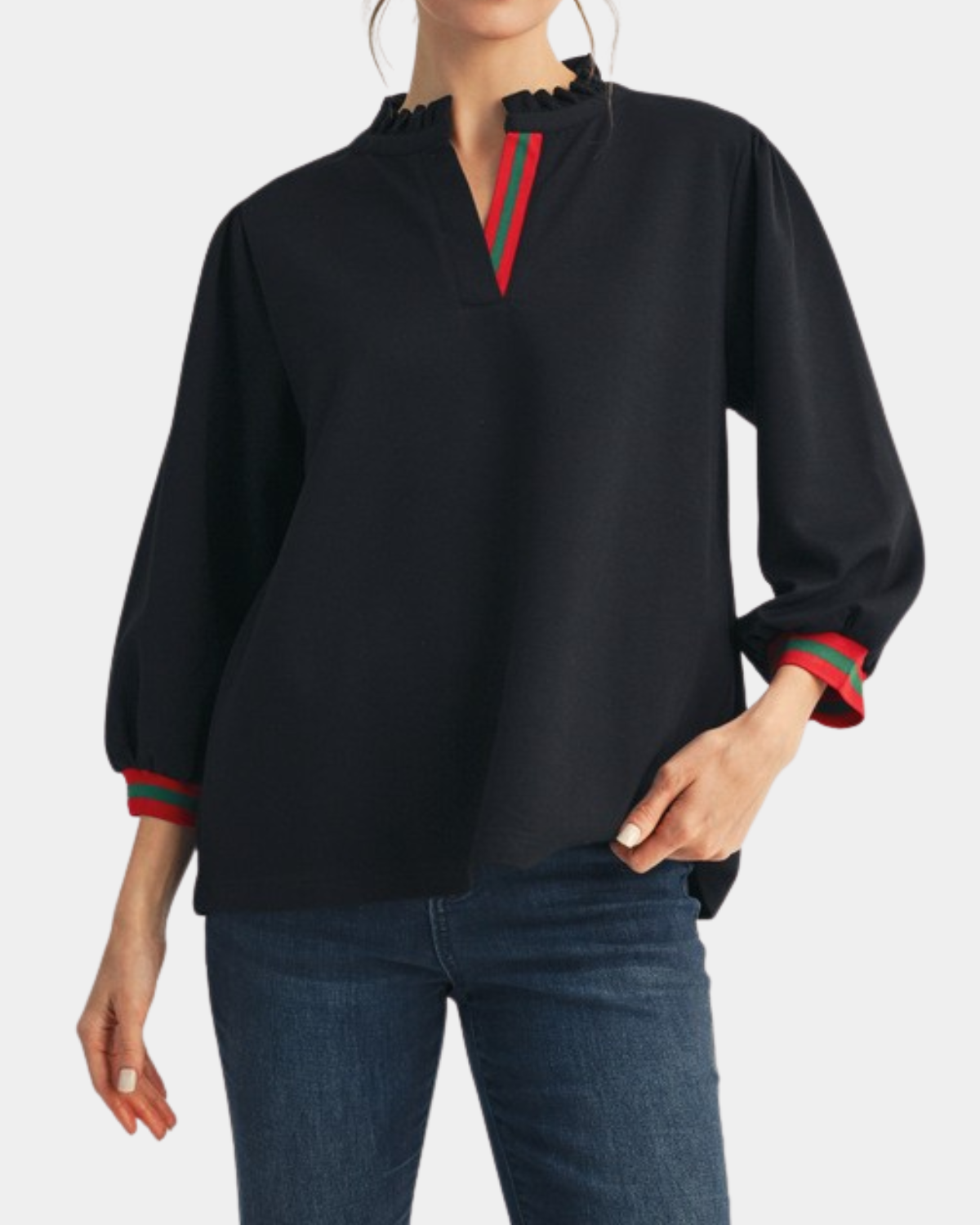 Colorful stripes meet playful ruffles in this charming top that's ready to turn heads. The contrast accent detailing at the neckline adds just the right amount of sass, while the classic stripe pattern keeps things effortlessly chic.