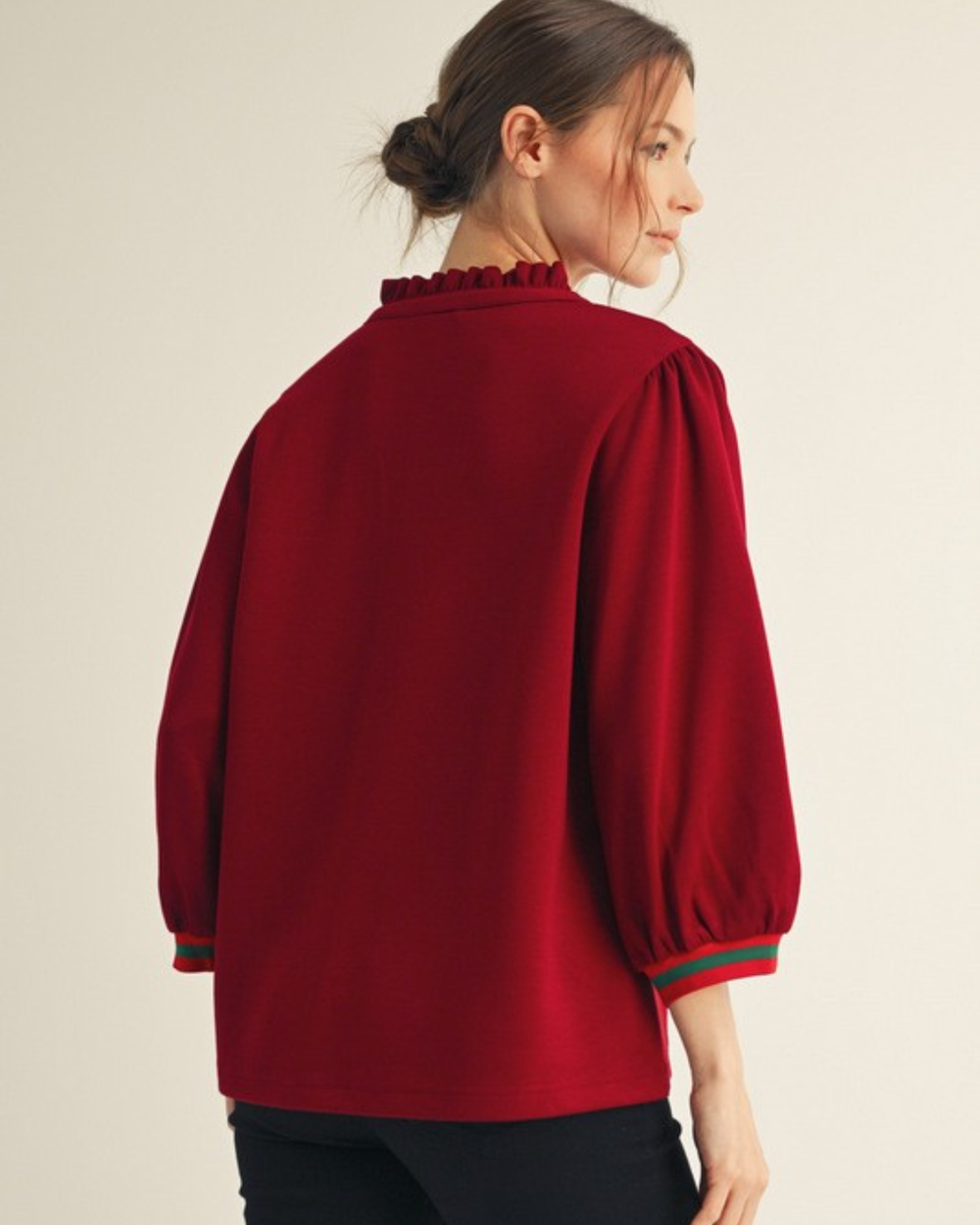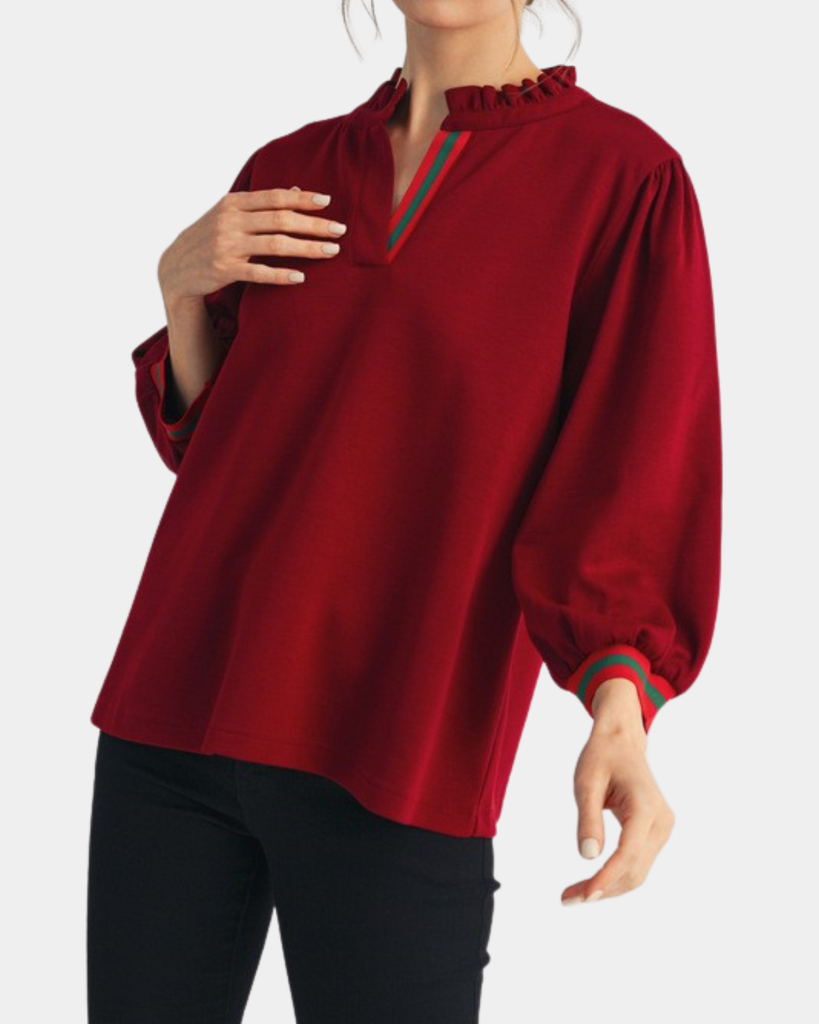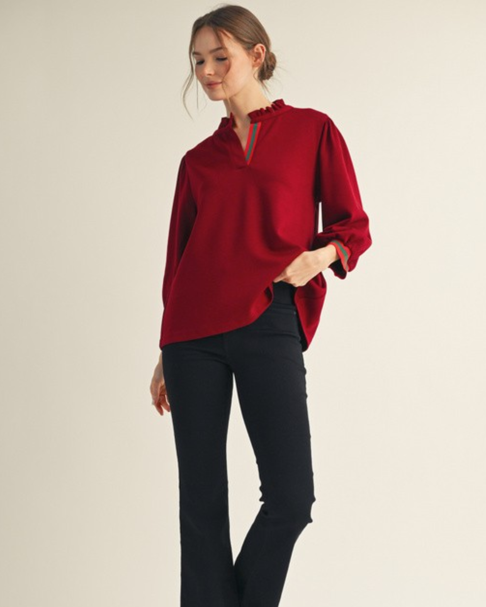 Burgundy stripes meet playful ruffles in this charming top that's ready to turn heads. The contrast accent detailing at the neckline adds just the right amount of sass, while the classic stripe pattern keeps things effortlessly chic.
