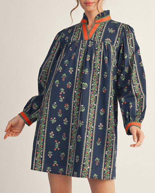 Elevate your autumn wardrobe with this sophisticated floral mini dress in navy. Featuring long sleeves and delicate ruffled standing neckline, it offers a refined silhouette with a touch of romance. The solid contrast details and fall-inspired print capture the season’s essence, while convenient side pockets blend style with practicality.