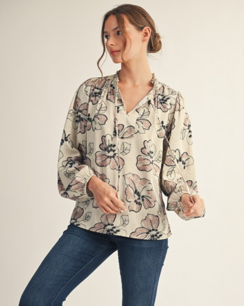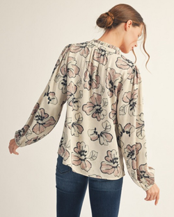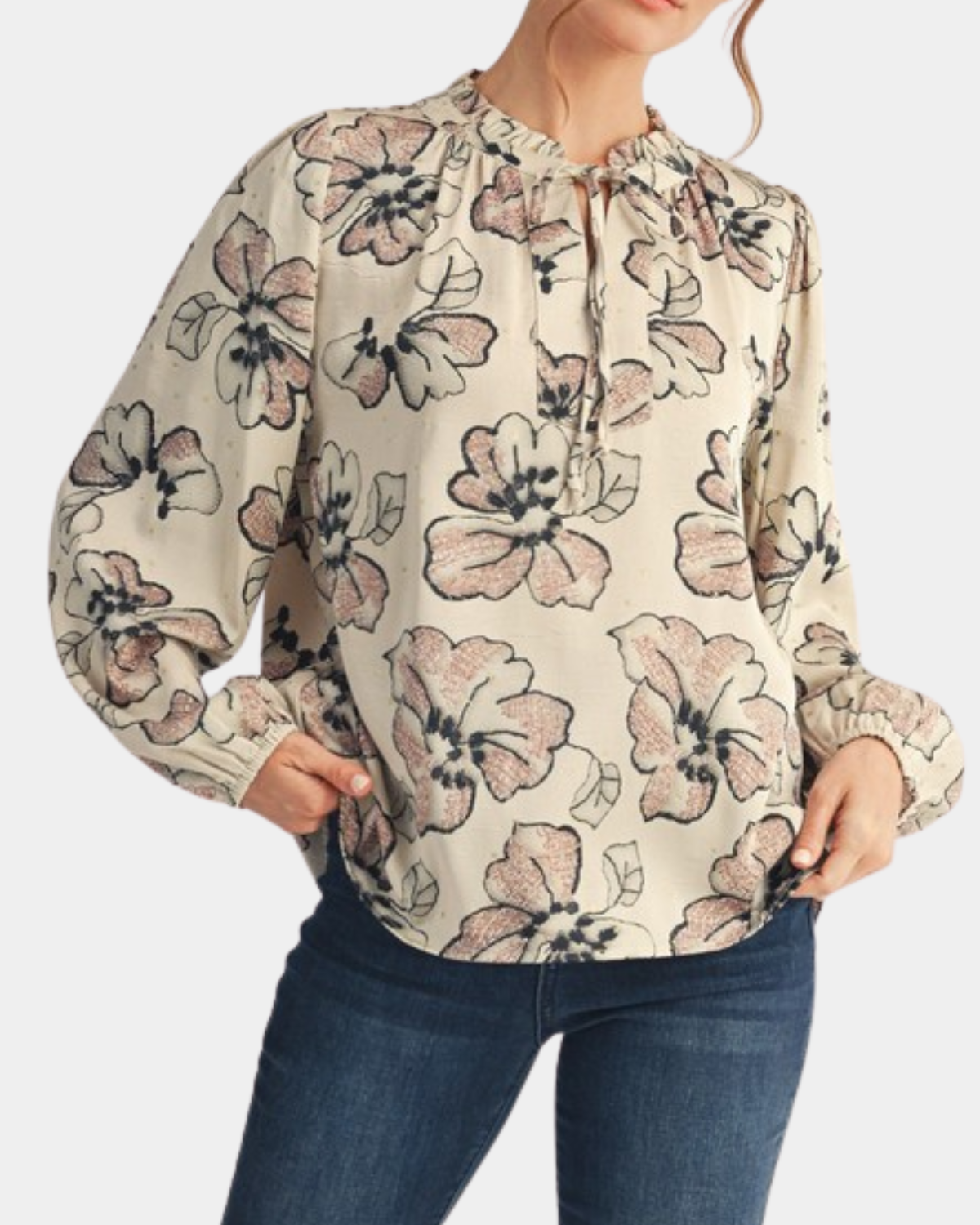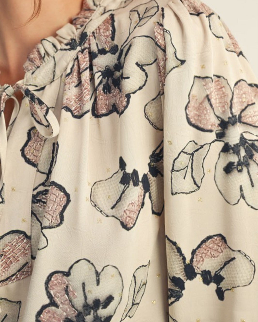 Sparkle and bloom in this champagne floral top with dazzling gold glitter details. Whether you're heading out for brunch or a night on the town, this playful piece adds just the right amount of shimmer to your look.