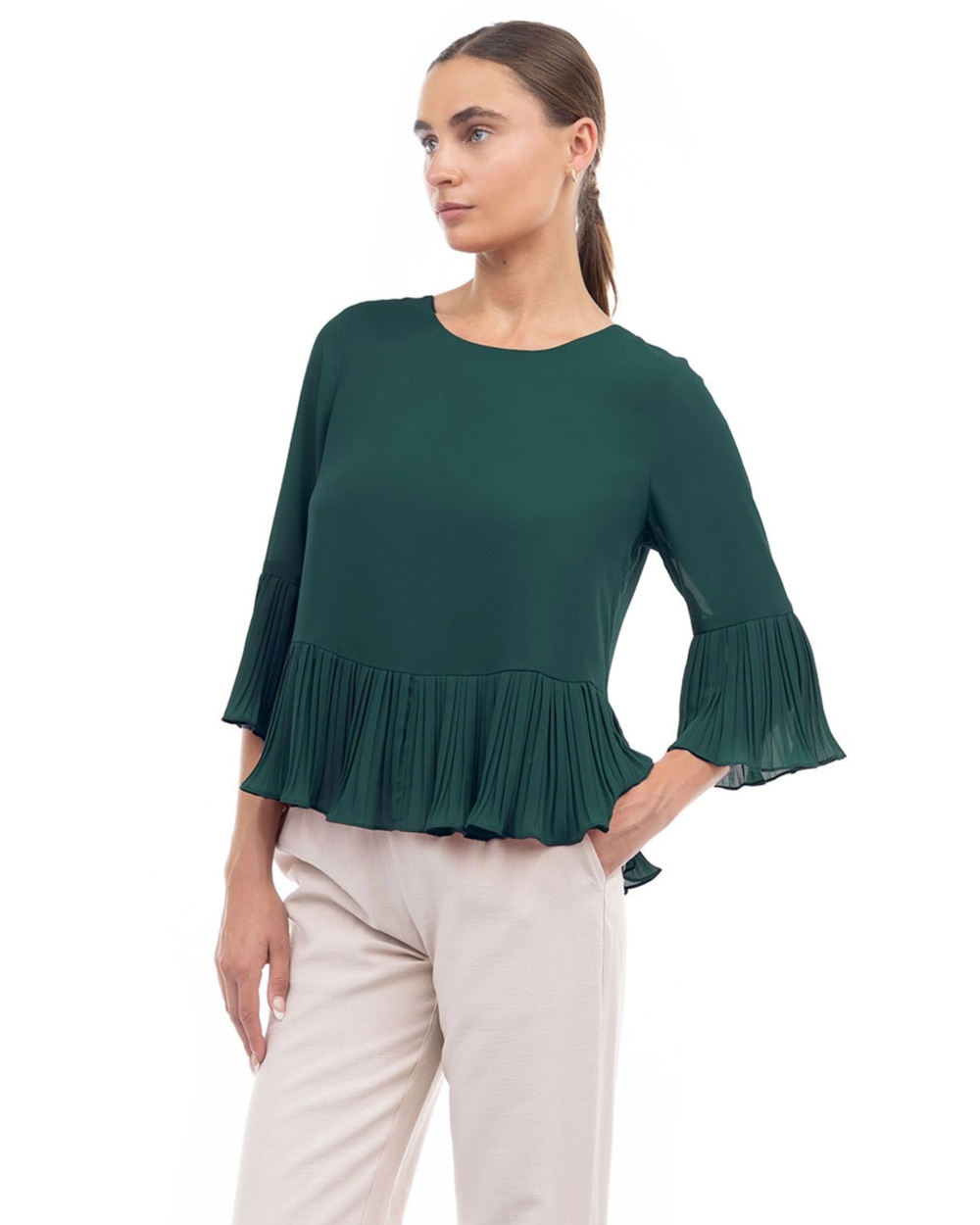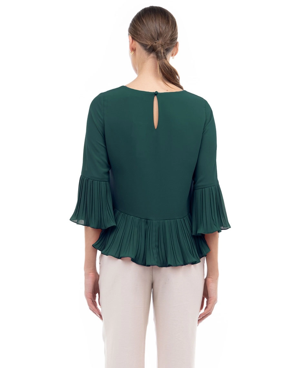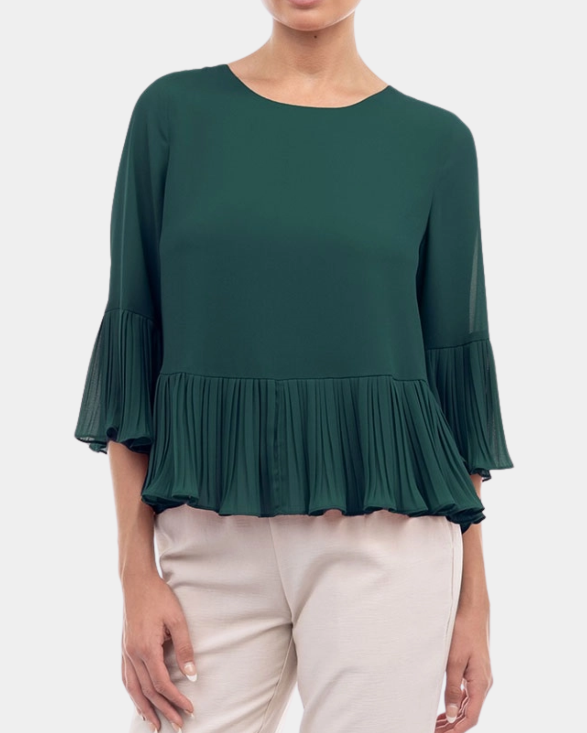Elevate your everyday style with this charming pleated blouse. The three-quarter sleeves strike the perfect balance between polished and relaxed, while delicate pleats add dimension and movement.