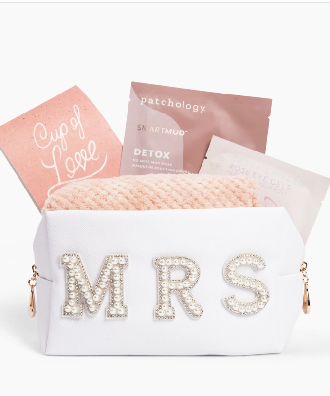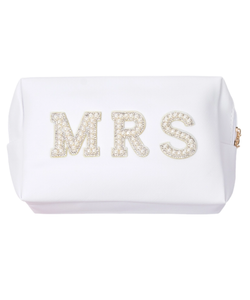 This compact and travel-friendly bag fits effortlessly into purses and suitcases, making it convenient for both daily use and travel. It opens to reveal a roomy interior, perfect for securely storing all your makeup essentials. This bag is not just practical, but also a fashionable accessory, ideal gift for the bride-to-be! This makeup bag boasts a chic and elegant design, adorned with faux pearl and rhinestone patches that add a touch of sophistication.
