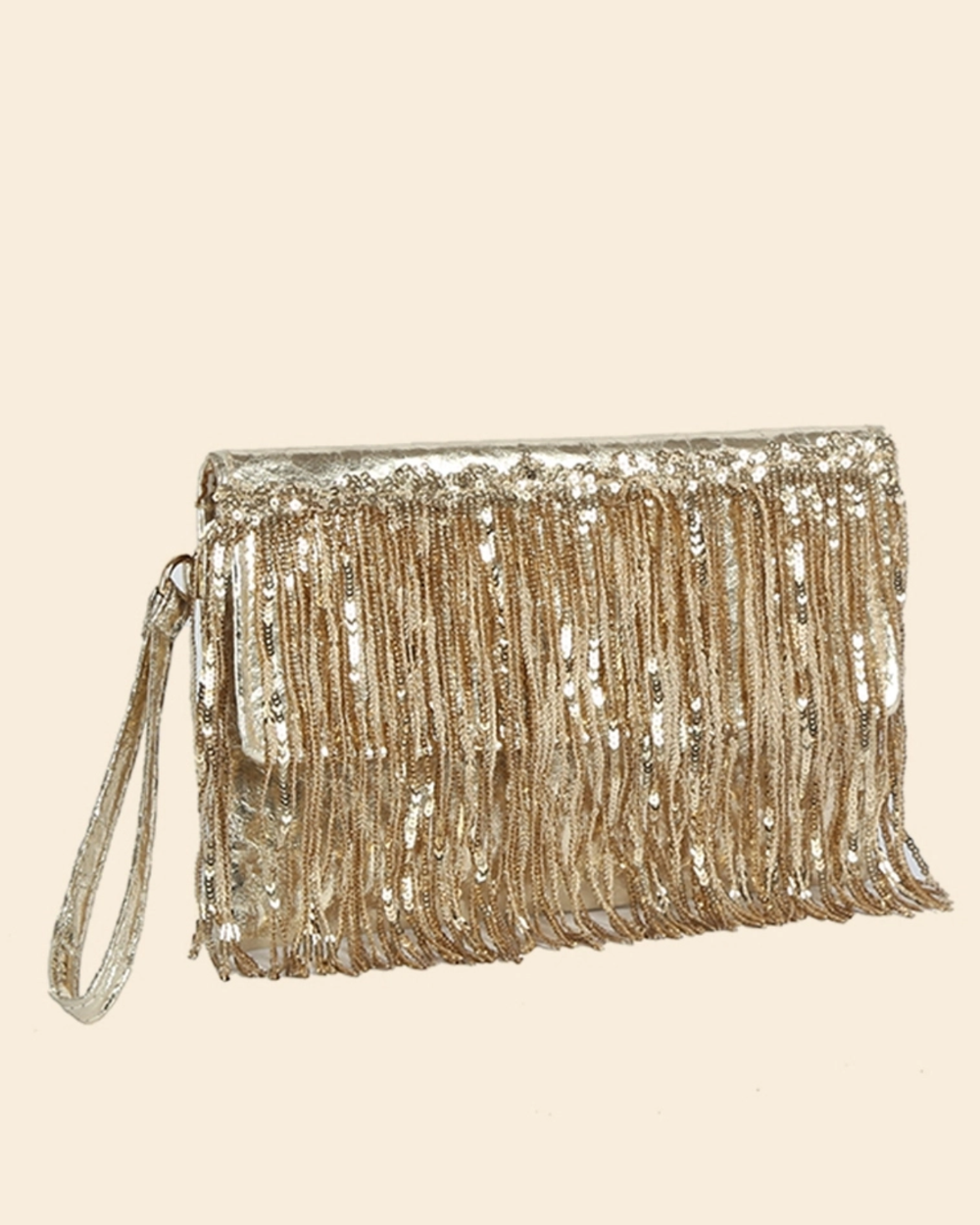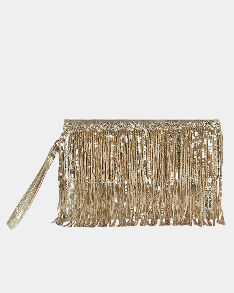 This clutch combines lustrous sequin fringe with timeless elegance, making it the perfect finishing touch for any sophisticated occasion.