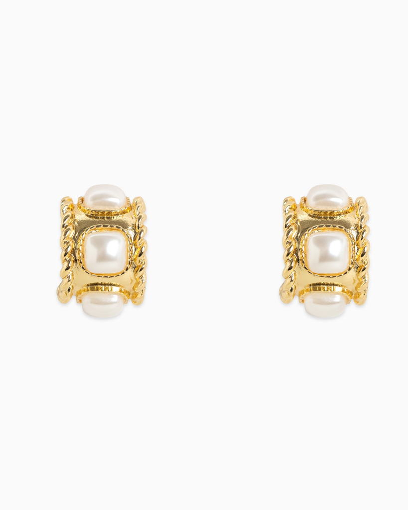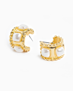 These gold-tone huggie earrings play with bold rope-textured edges and shiny pearl accents, creating a fun and eye-catching mix.