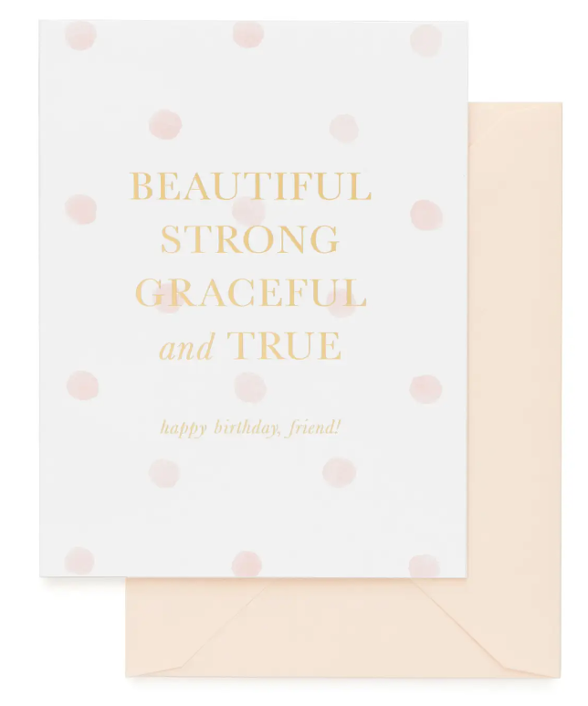 This Beautiful, Strong, Graceful, and True card is letterpress printed by hand on antique machinery. Gold foil on white and pale pink watercolor dot paper, paired with a pale pink envelope.