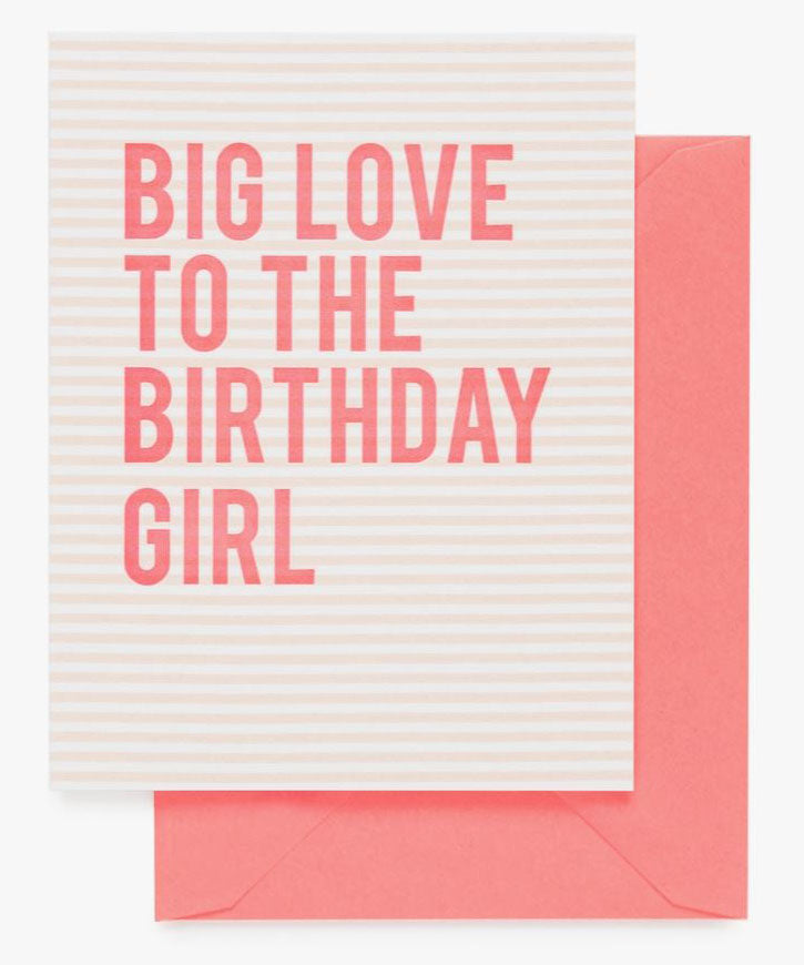 This "Big Love To The Birthday Girl" card is letterpress printed by hand on antique machinery.