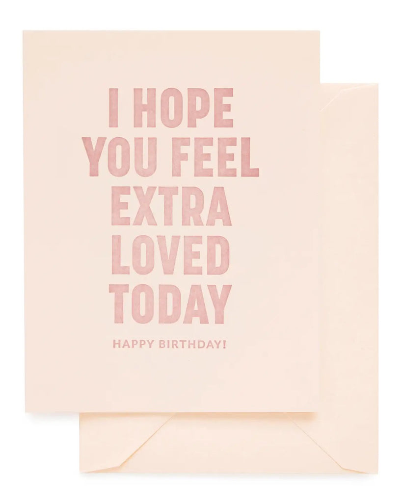 Our Extra Loved Birthday card is letterpress printed by hand on antique machinery. Rose ink on pale pink paper paired with a pale pink envelope. Folded card, blank inside.