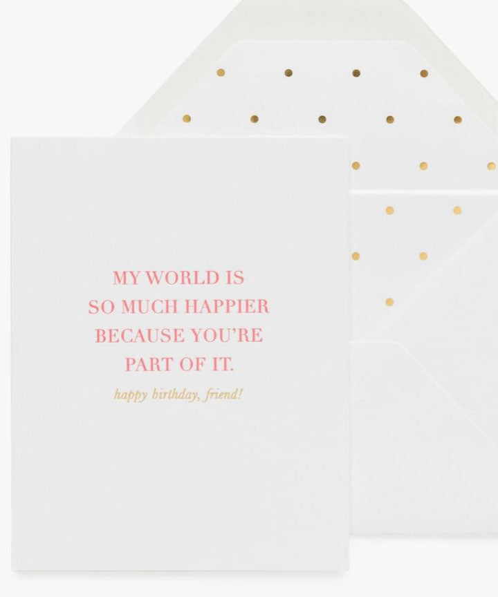This "My World Is Happier" card is letterpress printed by hand on antique machinery.