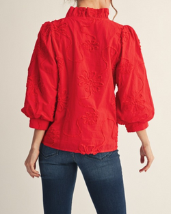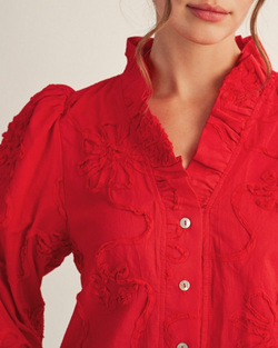 Brighten your look with this tomato red button-down top featuring playful 3D floral details that add a fun pop of texture.