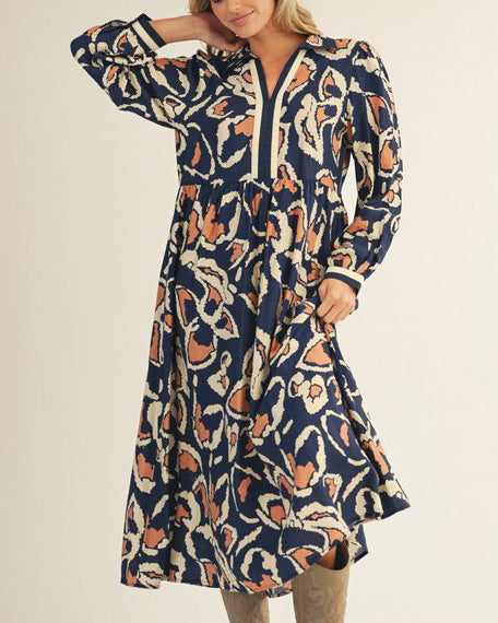 This elegant navy midi dress combines timeless sophistication with boho charm. Featuring long sleeves, a refined collared neckline, and tasteful solid contrast detailing, it effortlessly enhances your fall wardrobe. Practical side pockets add discreet functionality, making this dress as versatile as it is stylish for seasonal occasions.