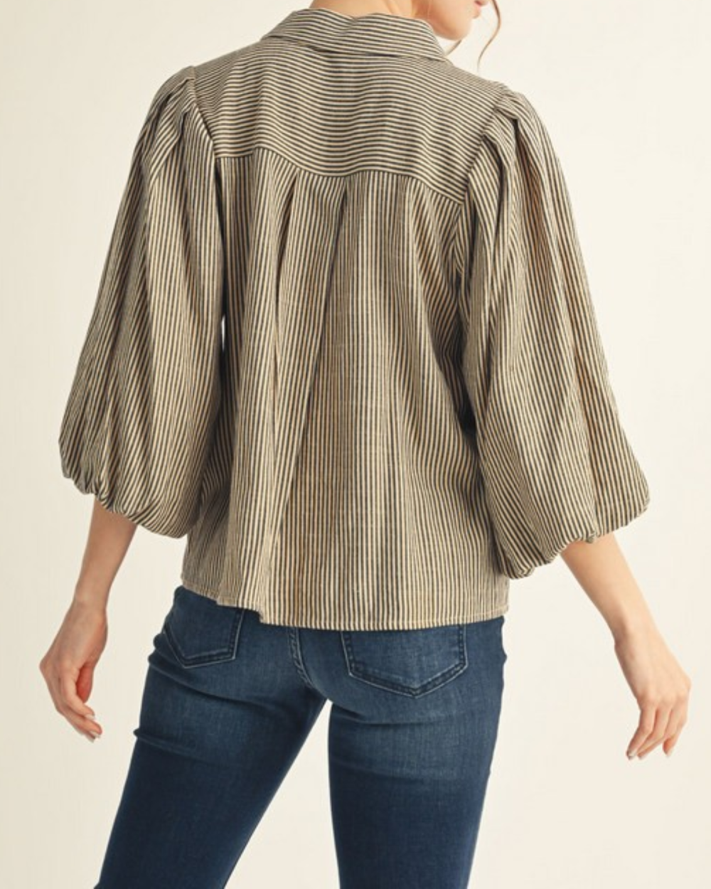 This light taupe striped top features playful puffed 3/4 sleeves and charming pleated shoulders for a stylish twist on your everyday look.