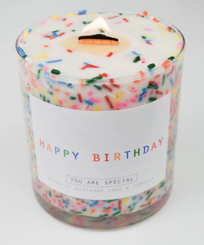 A very fitting Birthday gift! May this unique candle with real sprinkles inside light up your loved one's life with smiles and good smells! It smells like birthday cake with strong notes of sugar, buttercream, honey, and vanilla. The front label says HAPPY BIRTHDAY and 'you are special'. The back of this candle says 'continue good by giving a compliment to the birthday person!'