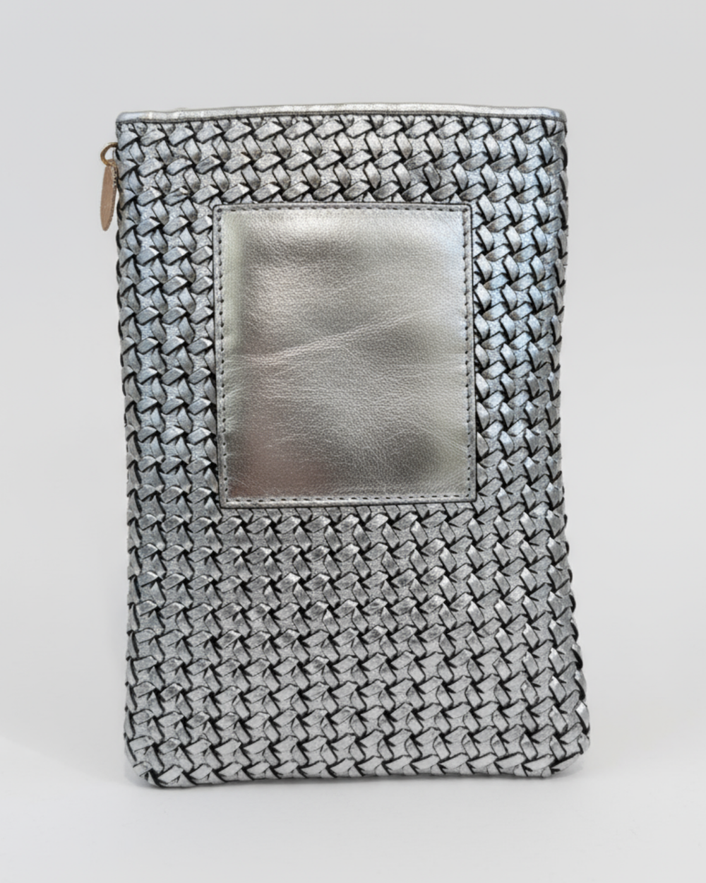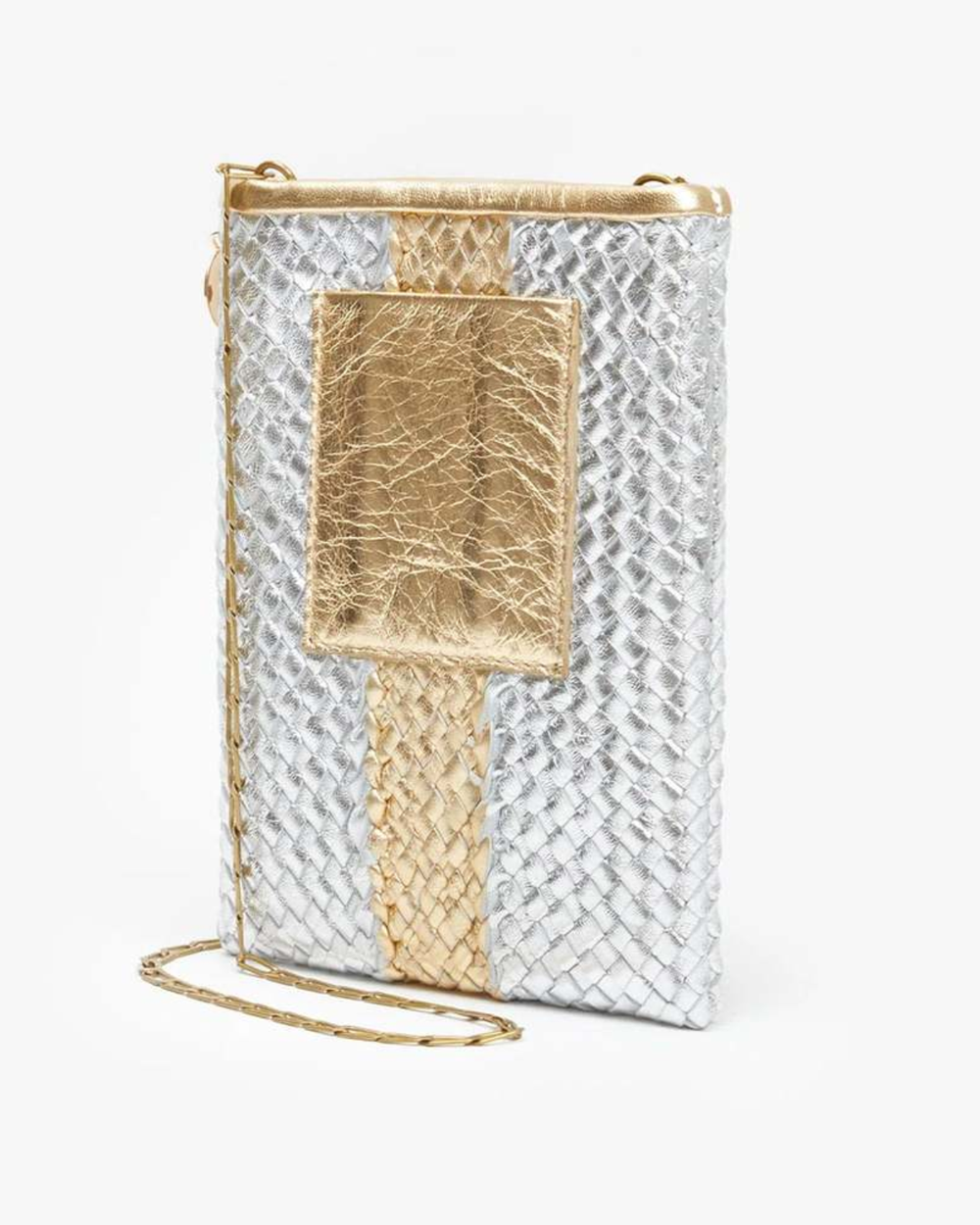 Crafted from handwoven leather with a lustrous metallic finish, Clare V.'s Poche features a 45" crossbody strap, a rear exterior pocket, a snap closure inside, and a chambray-lined interior for a refined touch.