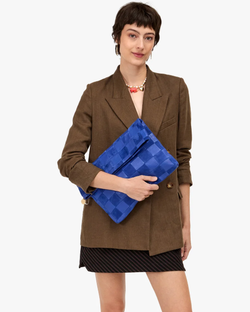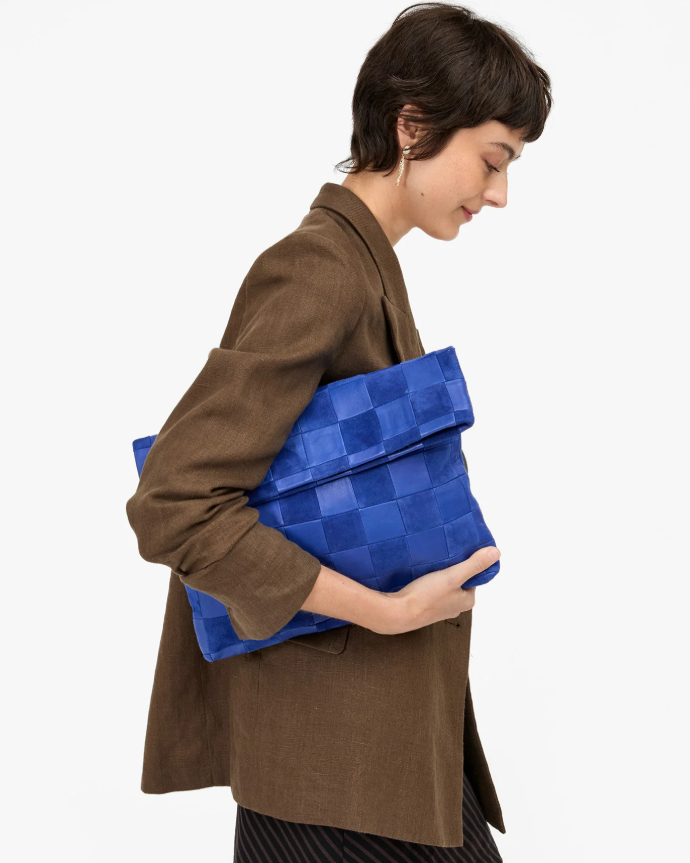 This clutch carries it all. Bigger than the original fold over clutch from Clare. V., she's got generous capacity and a magnetic snap closure and tabs to add a strap to turn her into a tote bag.