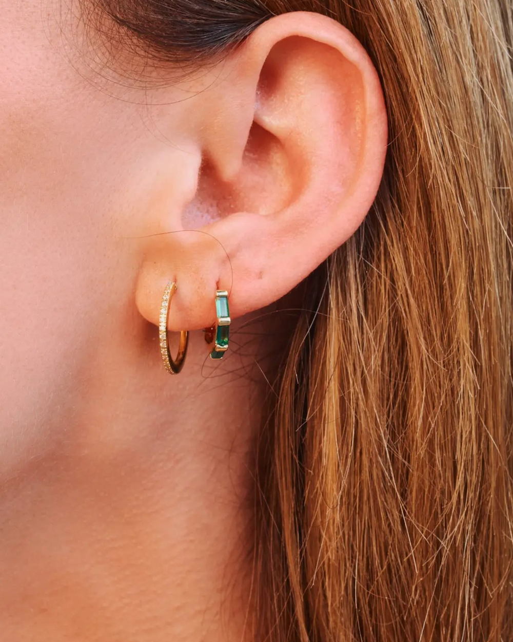 Delicately crafted in gold, these Emerald Huggies add a refined touch of elegance to any ensemble.