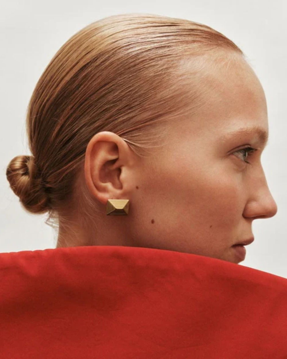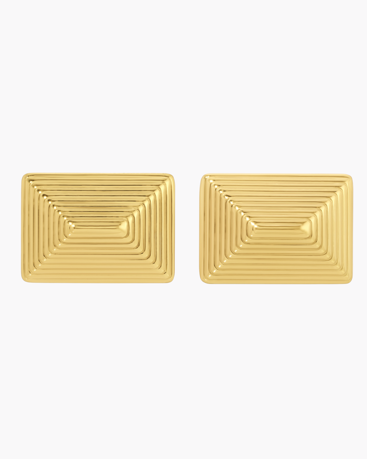 Rooted in Art Deco design principles, the Baby Celeste Earrings feature geometric ridged rectangles that echo vintage architectural detailing. These mini statements balance minimalist restraint with ornamental sophistication. Their sculpted form delivers structural impact for versatile day-to-night styling with refined, understated elegance.