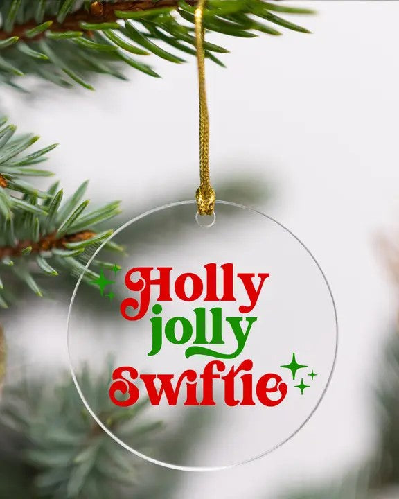 Add some fan flair to your holiday decorations with the Holly Jolly Swiftie Acrylic Ornament. Featuring fun and festive design, this ornament is perfect for any Taylor Swift fan. Spread some cheer and show off your fandom with this must-have addition to your ornament collection.