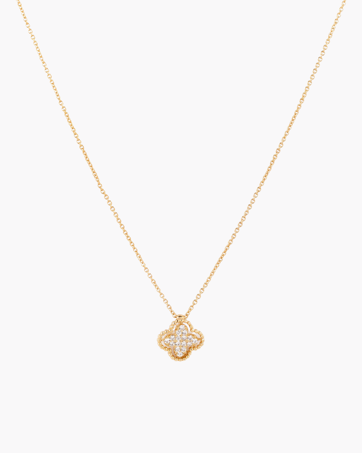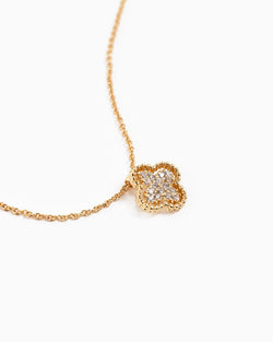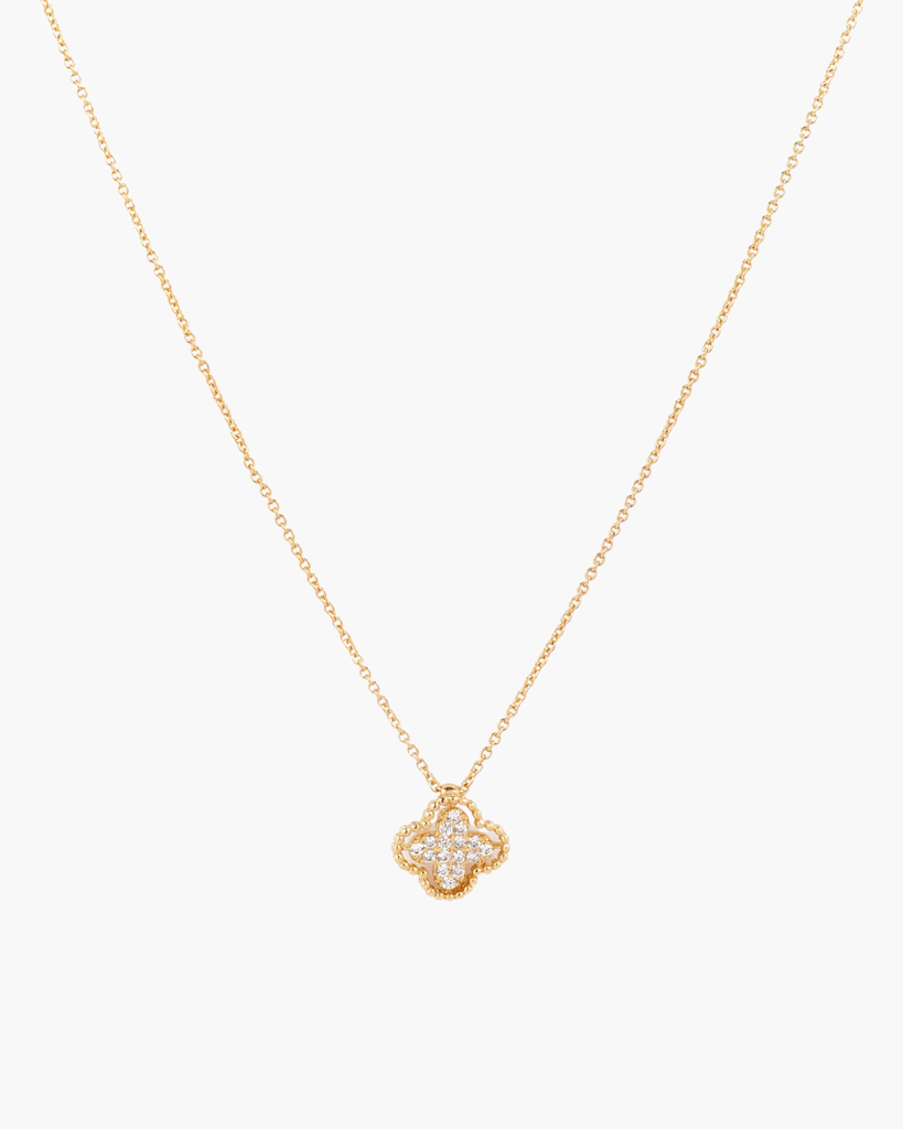 An elegant clover pendant with an open milgrain frame and sparkling CZ pavé center. Available in gold and silver for versatile sophistication.