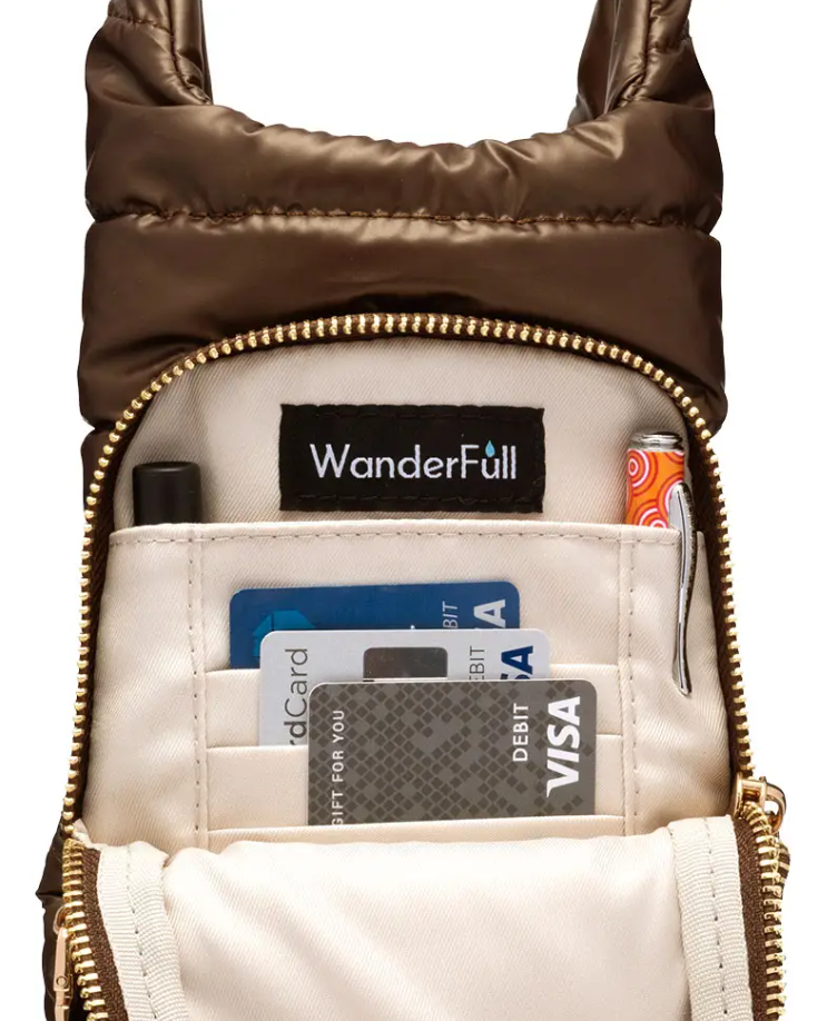 • This puffer bag fits bottles 3.5-in or less in diameter; Protects your essentials from spilled water; Ideal for water bottles, reusable soda & coffee cups, & wine bottles (great gift)!